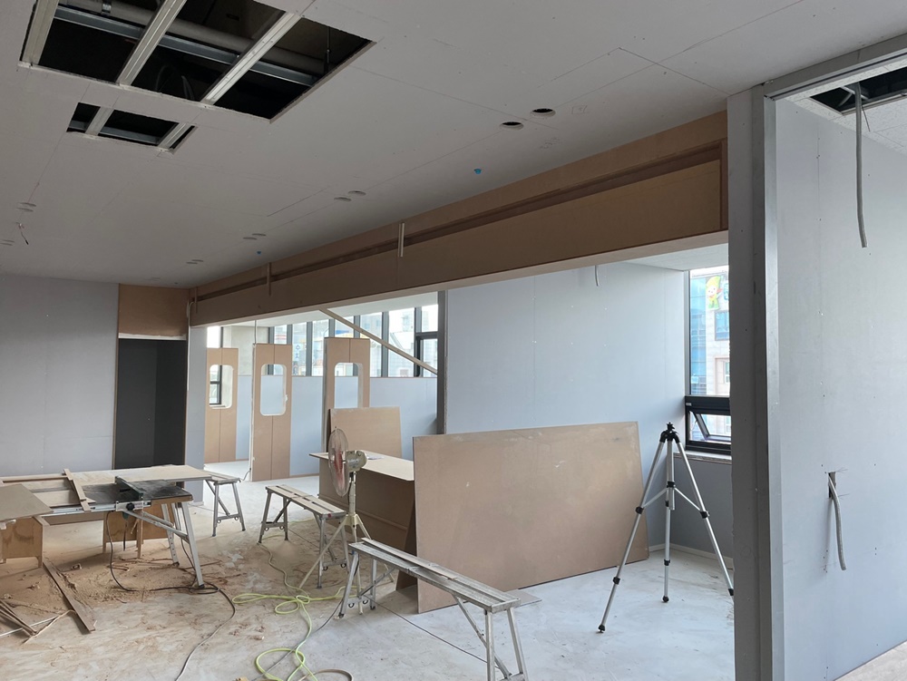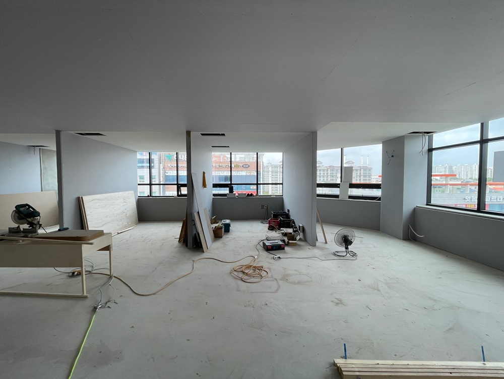 천장 공사는 흡음 재료를 사용하여 소음을 줄이고, 조명 설치를 위한 작업도 병행합니다.