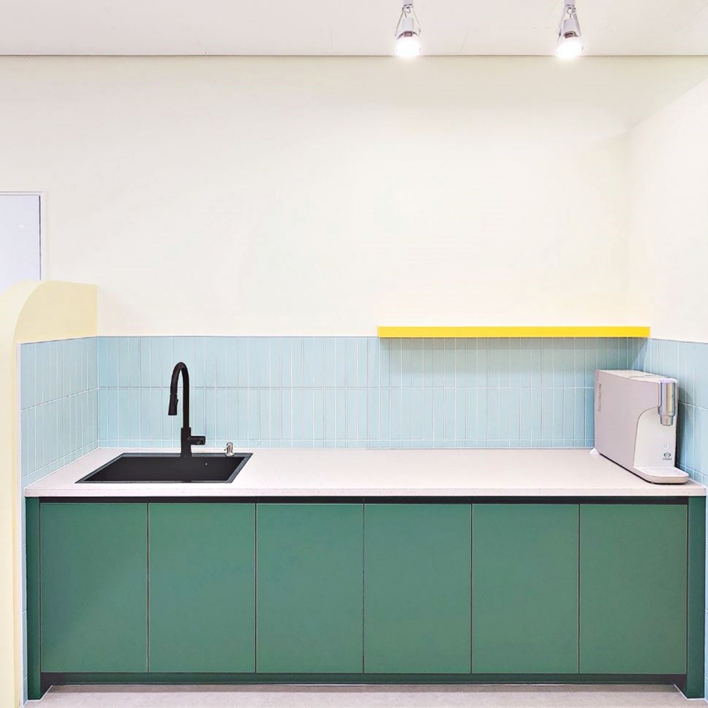 파스텔 톤을 기본으로 깔고 포인트 아트월에는 밝은 원색을 적절히 배치했죠.