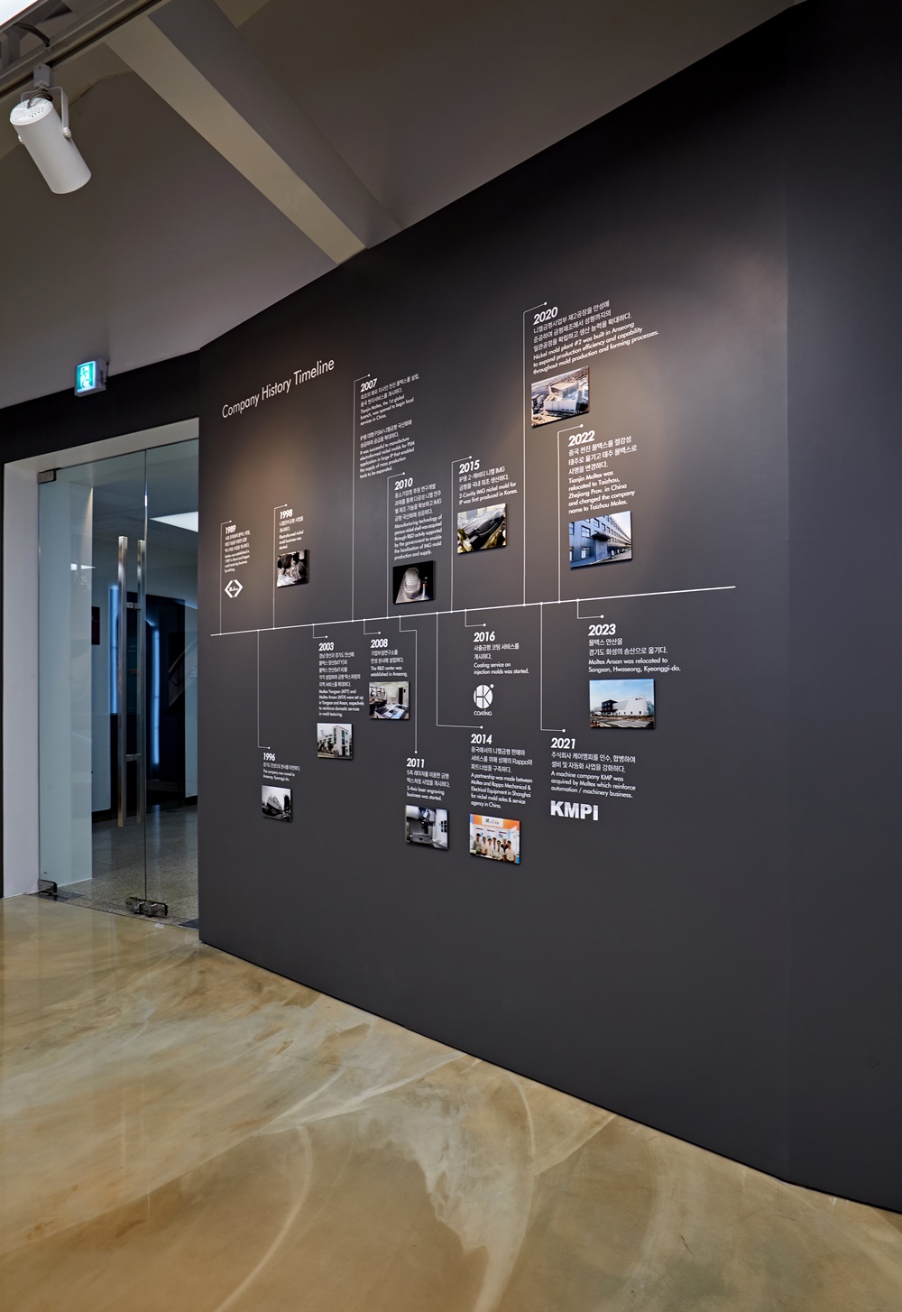 제품 설명과 타임라인 그래픽은 방문객이 읽기 편한 높이에 배치되었으며, 정보 전달력과 디자인미를 동시에 잡은 박람회인테리어 디자인을 목표로 3D디자인이 정교하게 조정되었습니다.