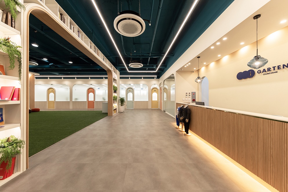 그래서 성인이 봤을 때 답답하지 않도록 노출형 천장으로 계획해 층고를 확보하고 깊이감을 줄 수 있는 진한색을 적용해 더욱 커 보일 수 있도록 했으며 라인 조명을 시공해 동선 유도 및 조도 확보의 두 마리 토끼를 잡을 수 있도록 했습니다. 아이들의 눈높이에 맞는 벽면은 아이보리 컬러로 계획하고 인포테이블 하단은 우드톤으로 마감해 따뜻하면서 깔끔한 느낌이 들도록 했으며 바닥은 연한 회색의 노출형으로 제안드렸습니다.