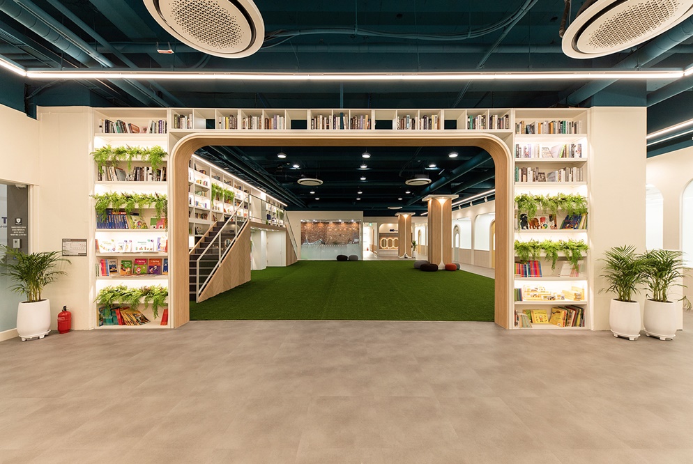 진입문의 내부는 청고형 타일을 적용해 또 다른 모습을 연출할 수 있어 어디에서 보느냐에 따라 분위기가 달라집니다. 홀의 한쪽 벽면은 도서관 책장을 두면 아이들이 쉬는 시간이나 기다리는 시간에 독서를 할 수 있어 유익한 시간을 보낼 수 있습니다.