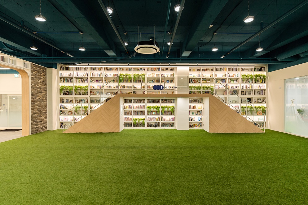 플랜테리어가 적용된 한쪽 벽면 책장의 모습입니다. 사다리를 두어 높이 있는 책도 쉽게 꺼낼 수 있도록 했고 중앙홀의 바닥은 인조 잔디 느낌이 나는 마감재를 적용해 아이들이 편안하게 이용할 수 있도록 제안드렸습니다. 범계 성동구 학원인테리어견적, 25평 35평 45평 공사비용은 디자인계획, 마감재, 맞춤가구 등에 따라 달라질 수 있어 포스팅에서는 정확하게 언급하지 않았습니다.