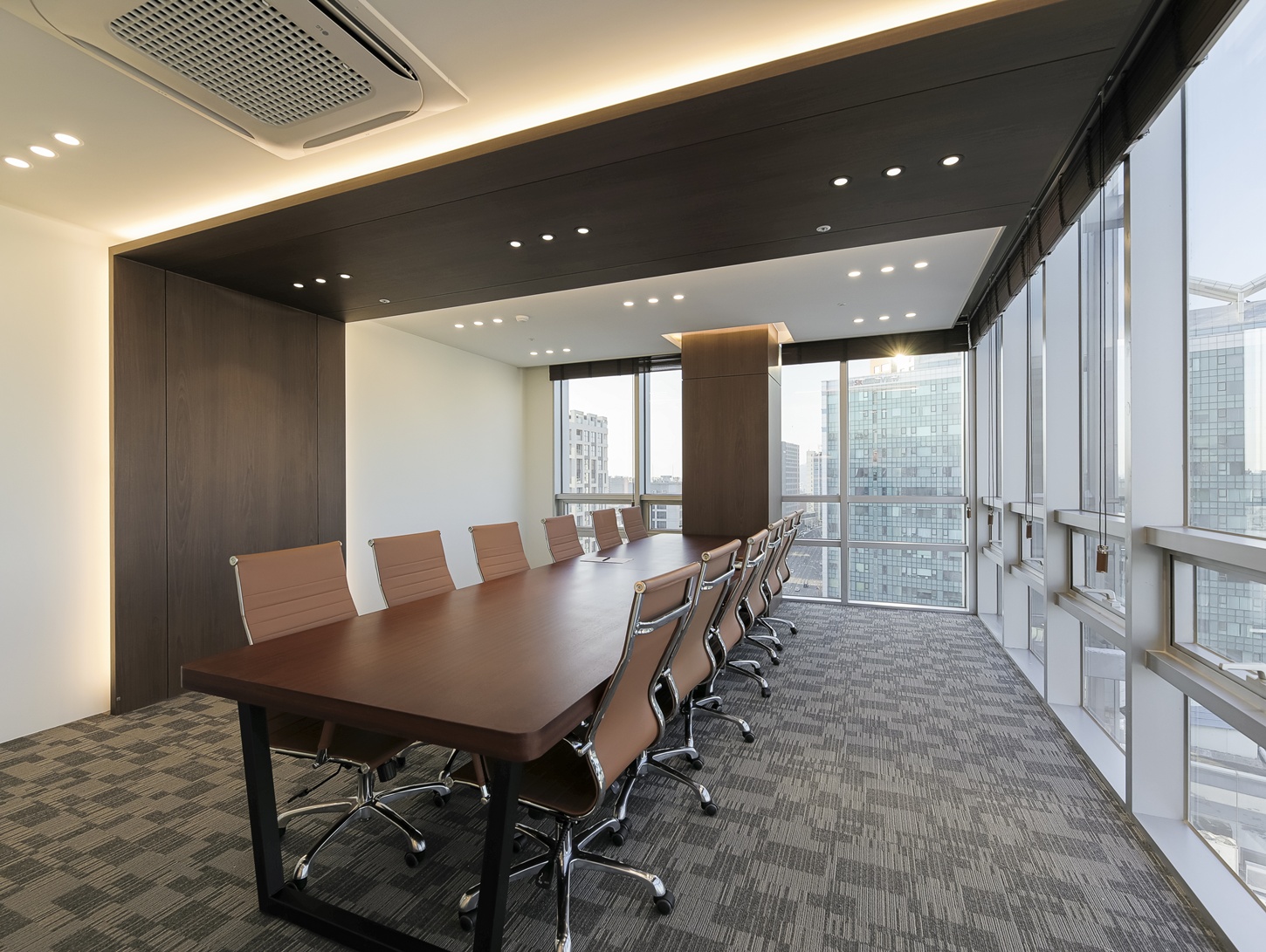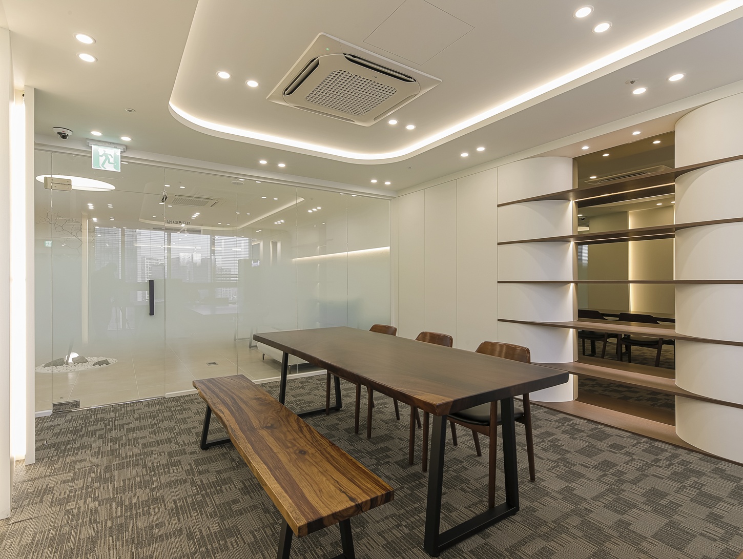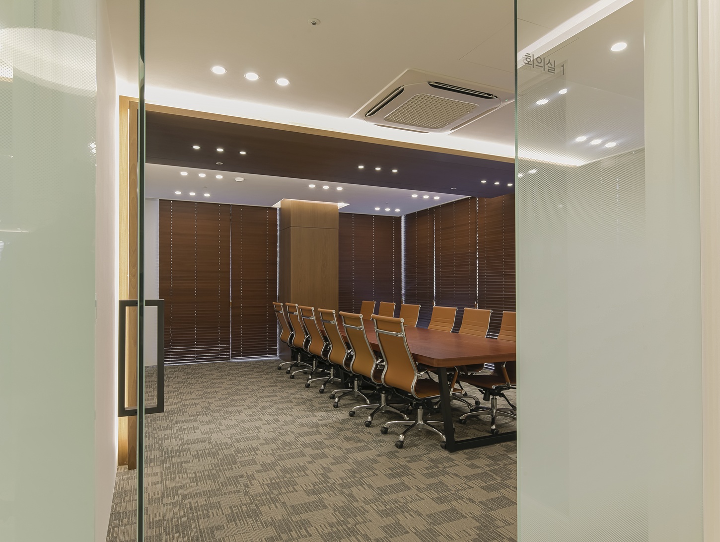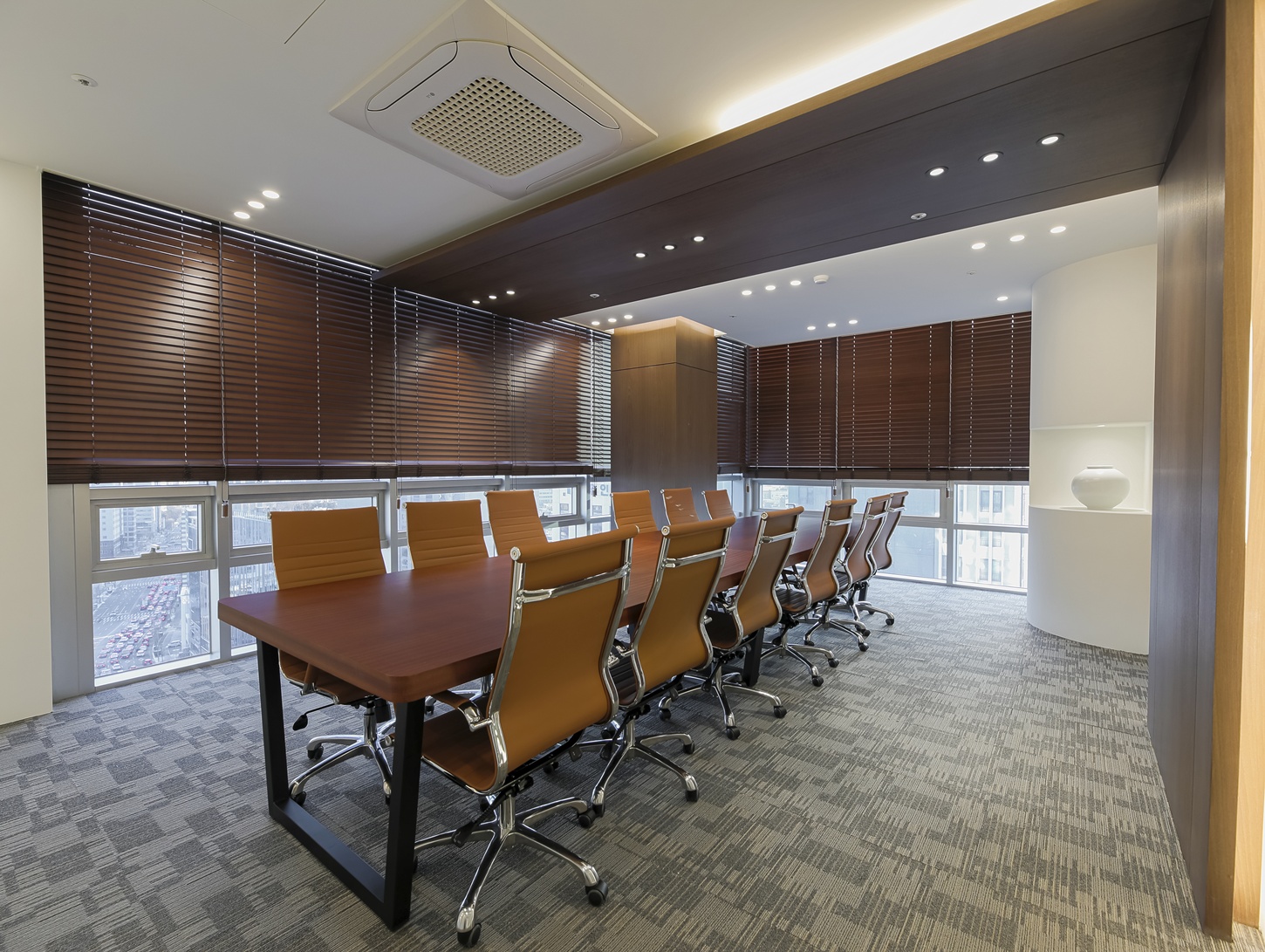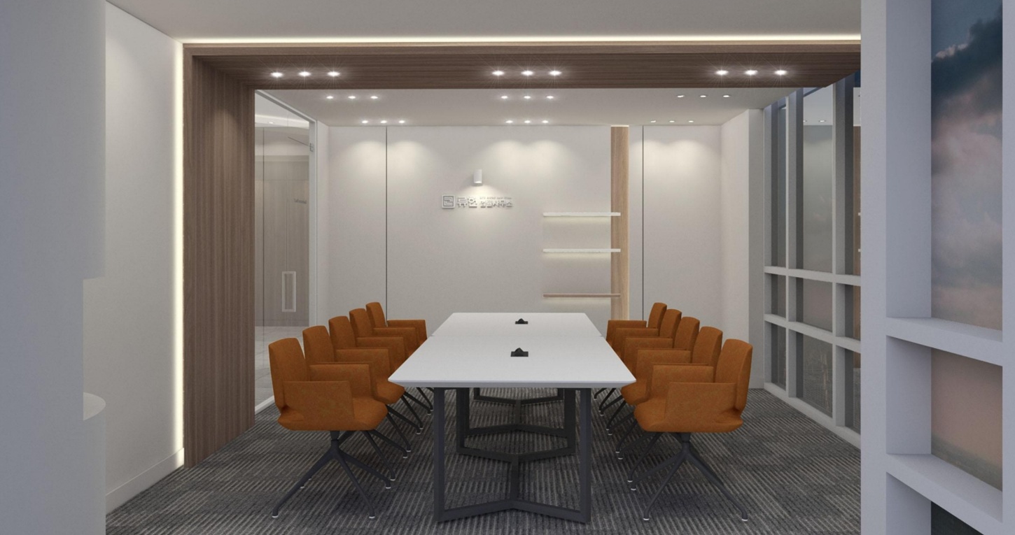 회의실은 집중도를 높일 수 있는 구조로 설계하였으며 우드 가구 특유의 따뜻함이 더해져
