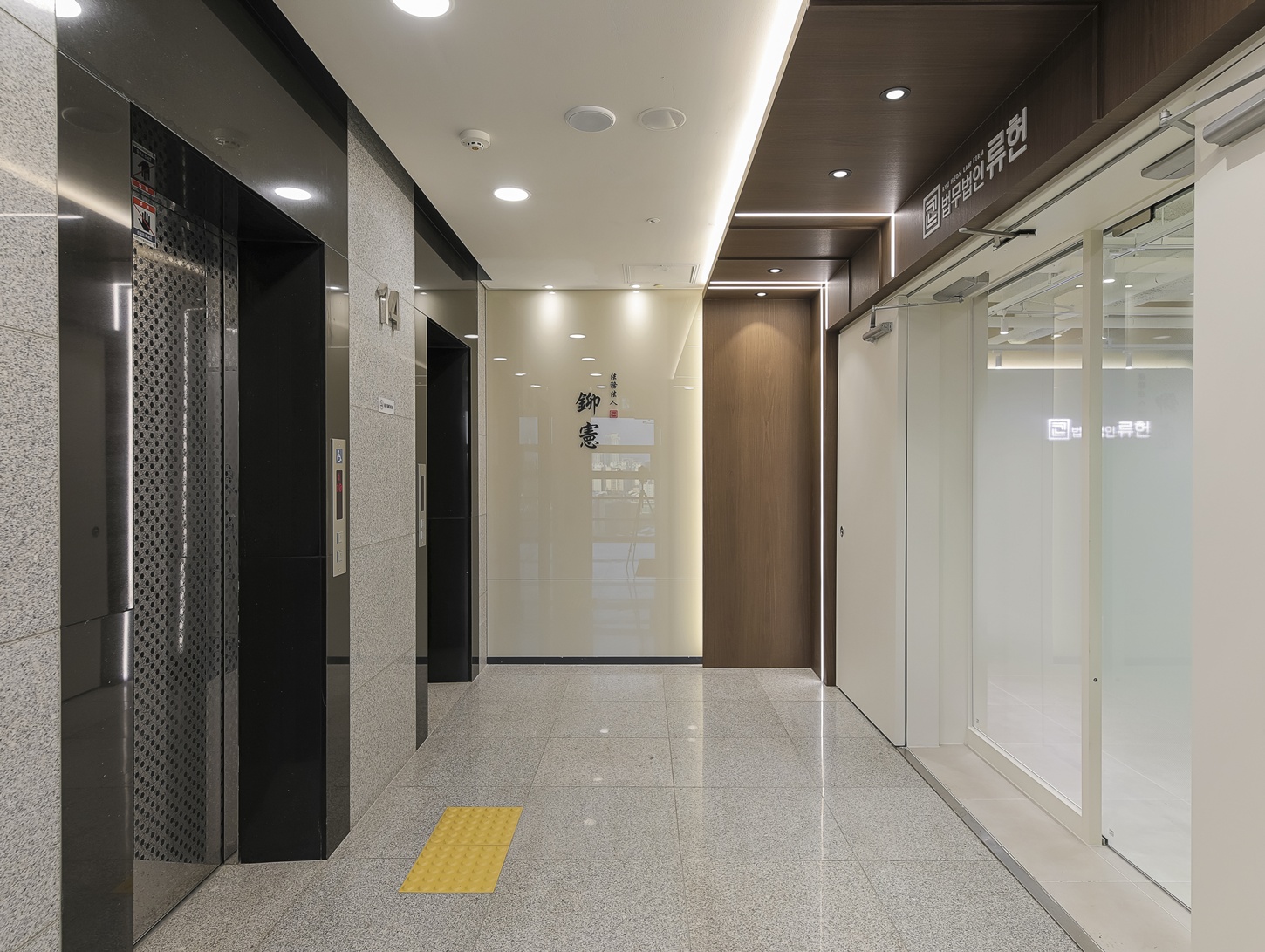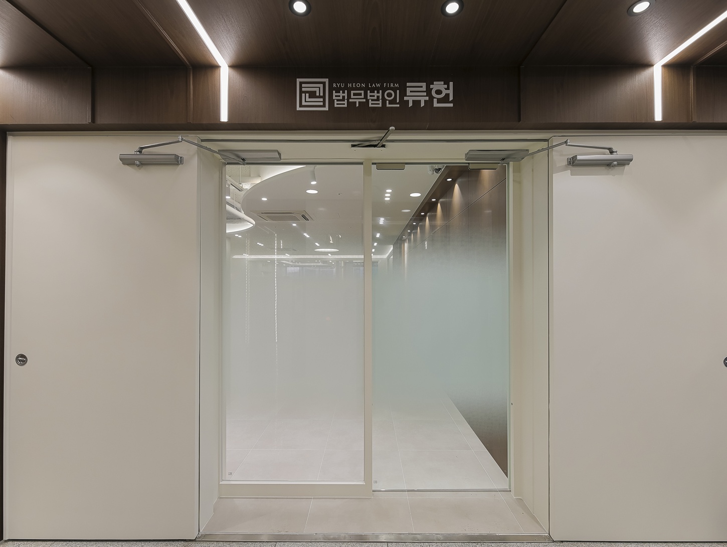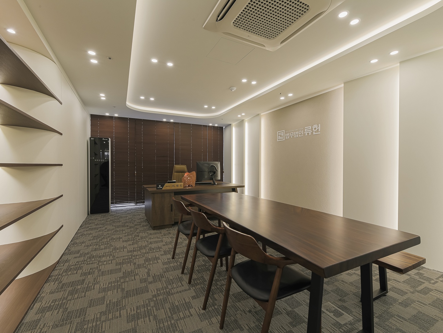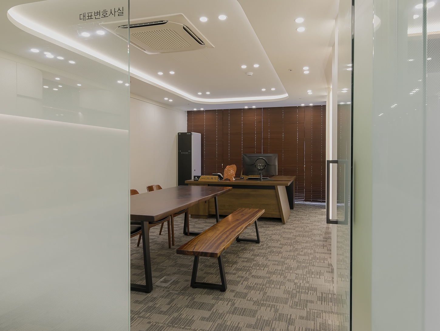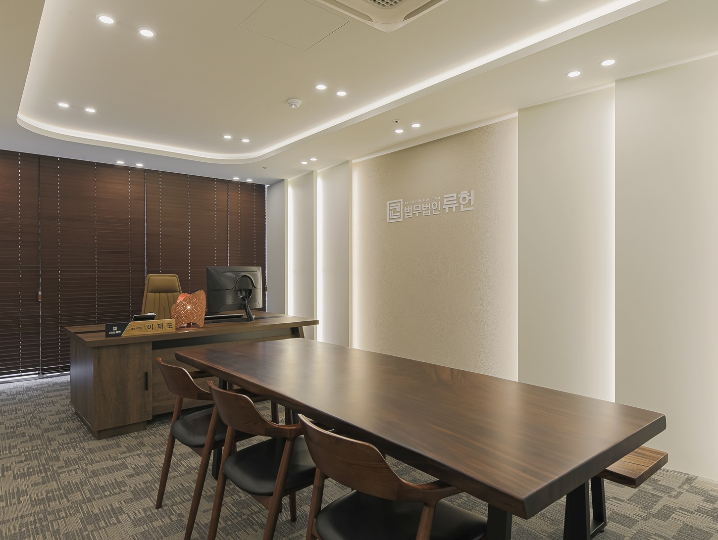 변호사 사무실의 내부 공간들은 우드 문을 활용하여 전체적으로 무게감 있는 연출에 중점을 두었습니다.
