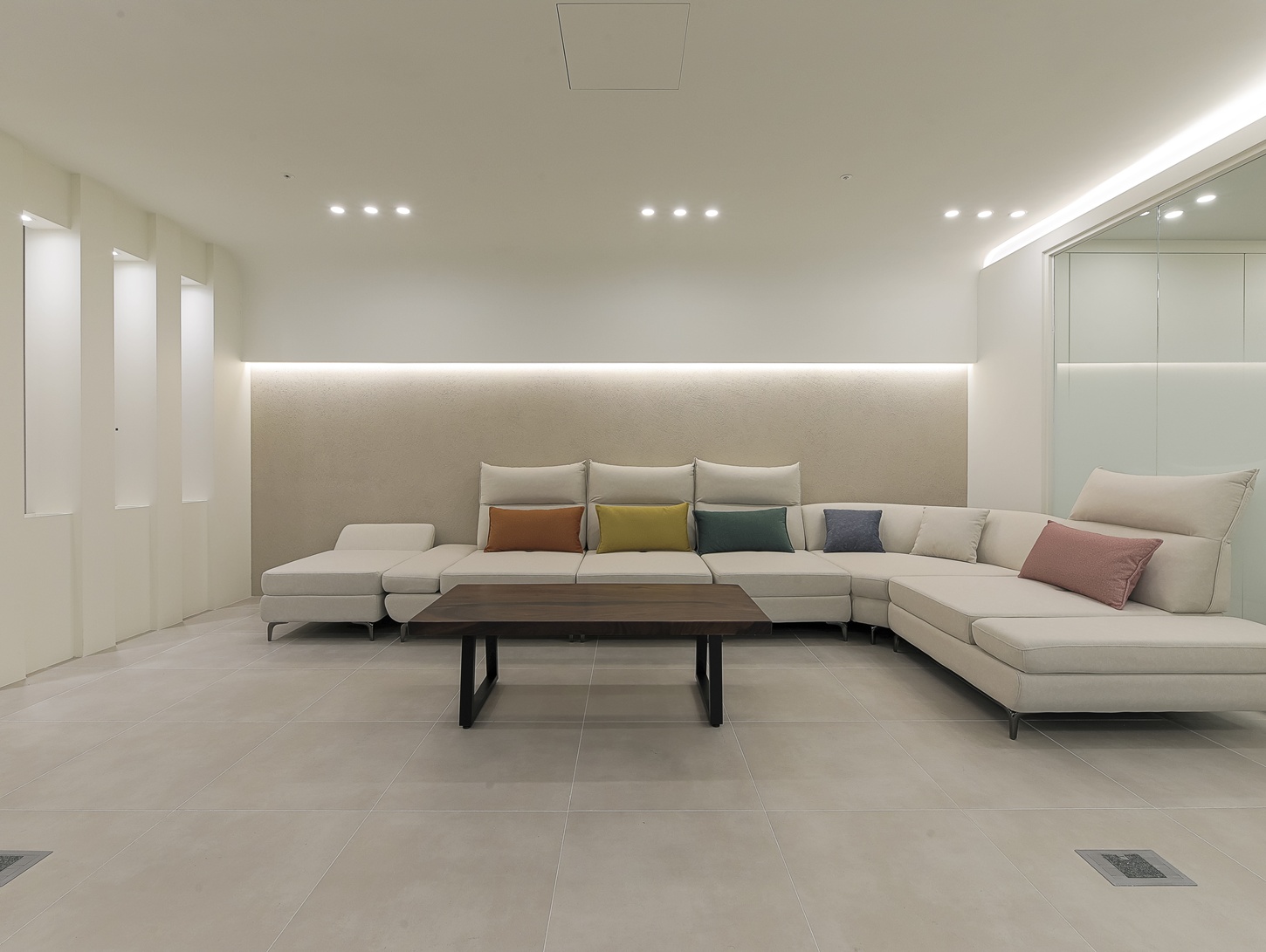 데스크 하단에는 은은한 간접 조명을 적용하여 공간이 떠 보이지 않고 안정감 있도록 연출했으며,