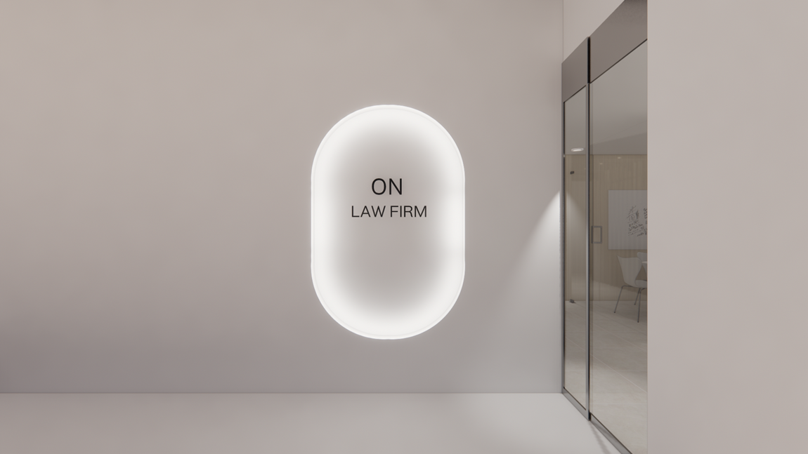 벽면에는 브랜드 로고와 조형물이 조화롭게 어우러져 법률사무소의 품격을 높이느 포인트 역할을 합니다.