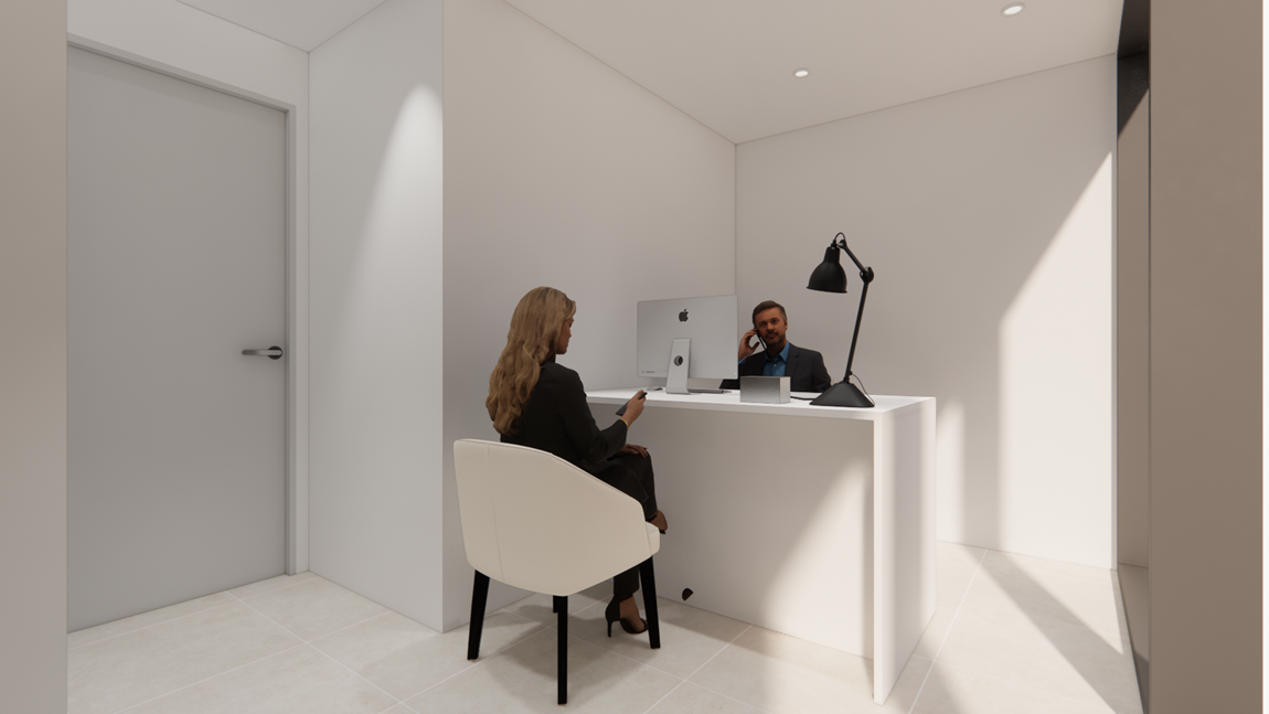 동시에 3D 모델링으로 입구 파사드의 라운드형 매립 벽면, 인포메이션 데스크 디자인, 유리가벽 회의실과 조명 연출까지 시뮬레이션하였습니다. 3D는 클라이언트가 조명 톤, 재질 질감, 시야각을 미리 확인하고 변경을 요청할 수 있개 해 오차를 줄여주었습니다.