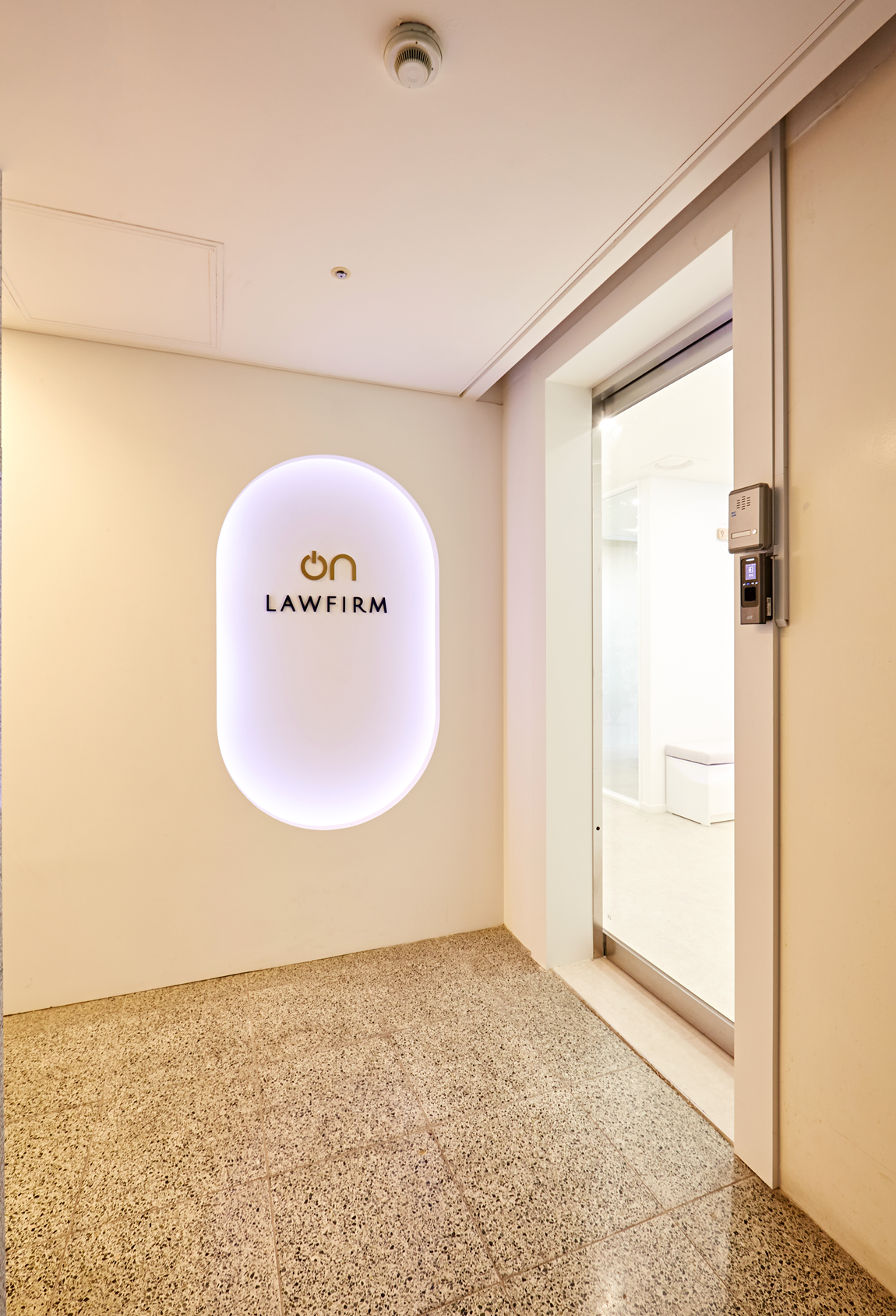 완공된 변호사인테리어 입구 파사드는 라운드형 매립 벽면 디자인을 적용하여 부드럽고 유연한 인상이 느껴지도록 설계했습니다.