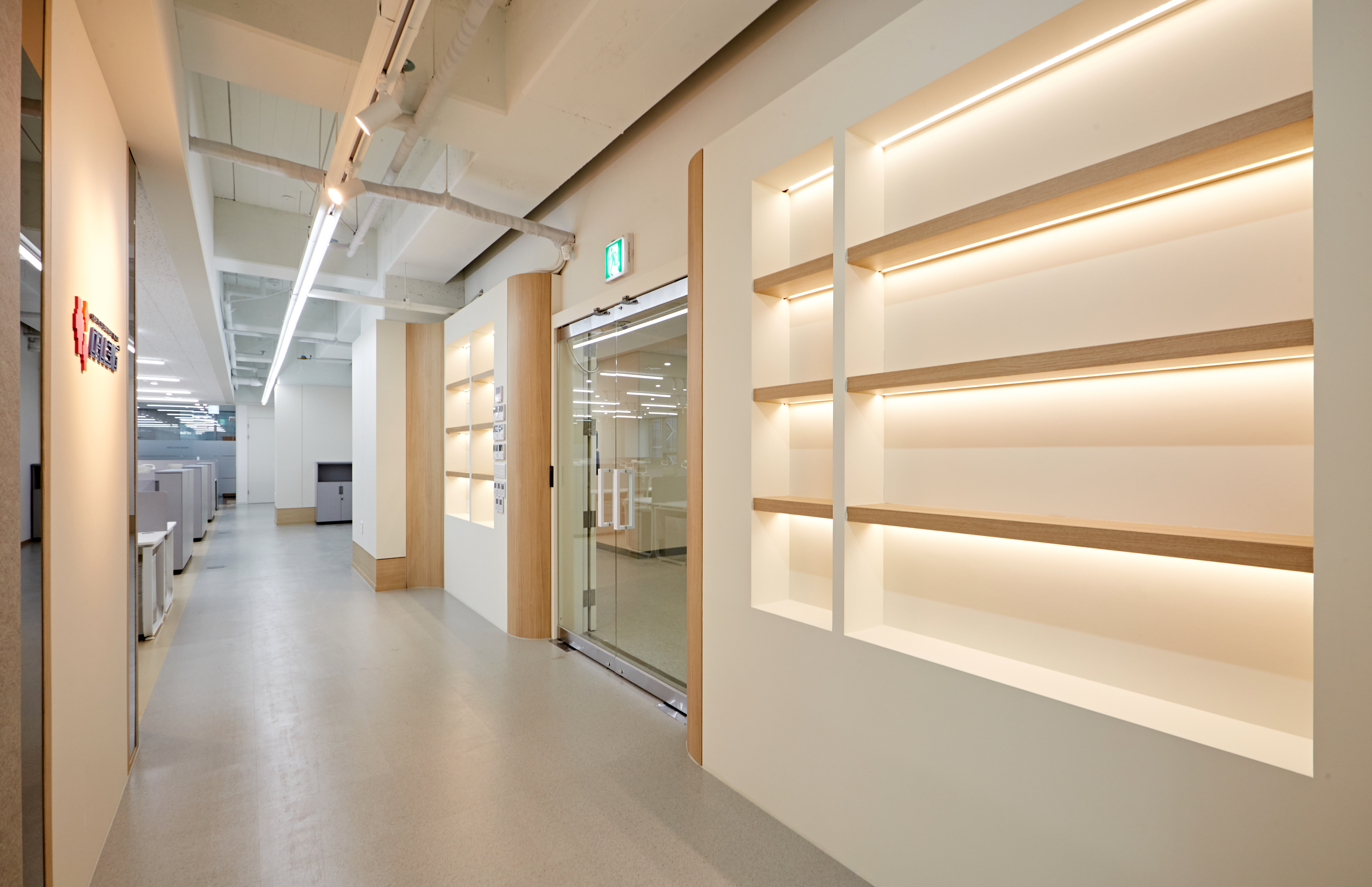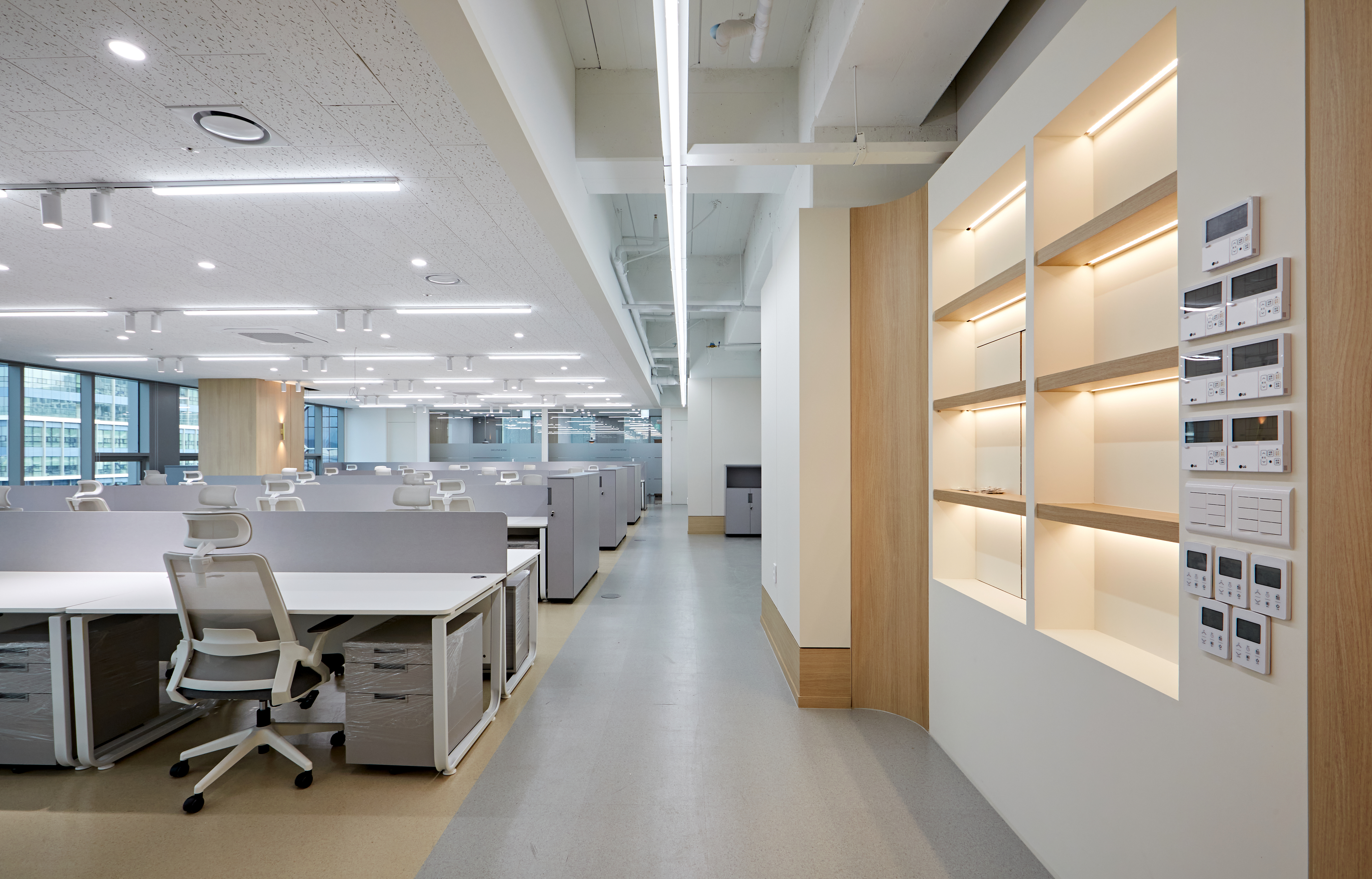 공용 사무 공간은 산뜻한 백색 조명으로