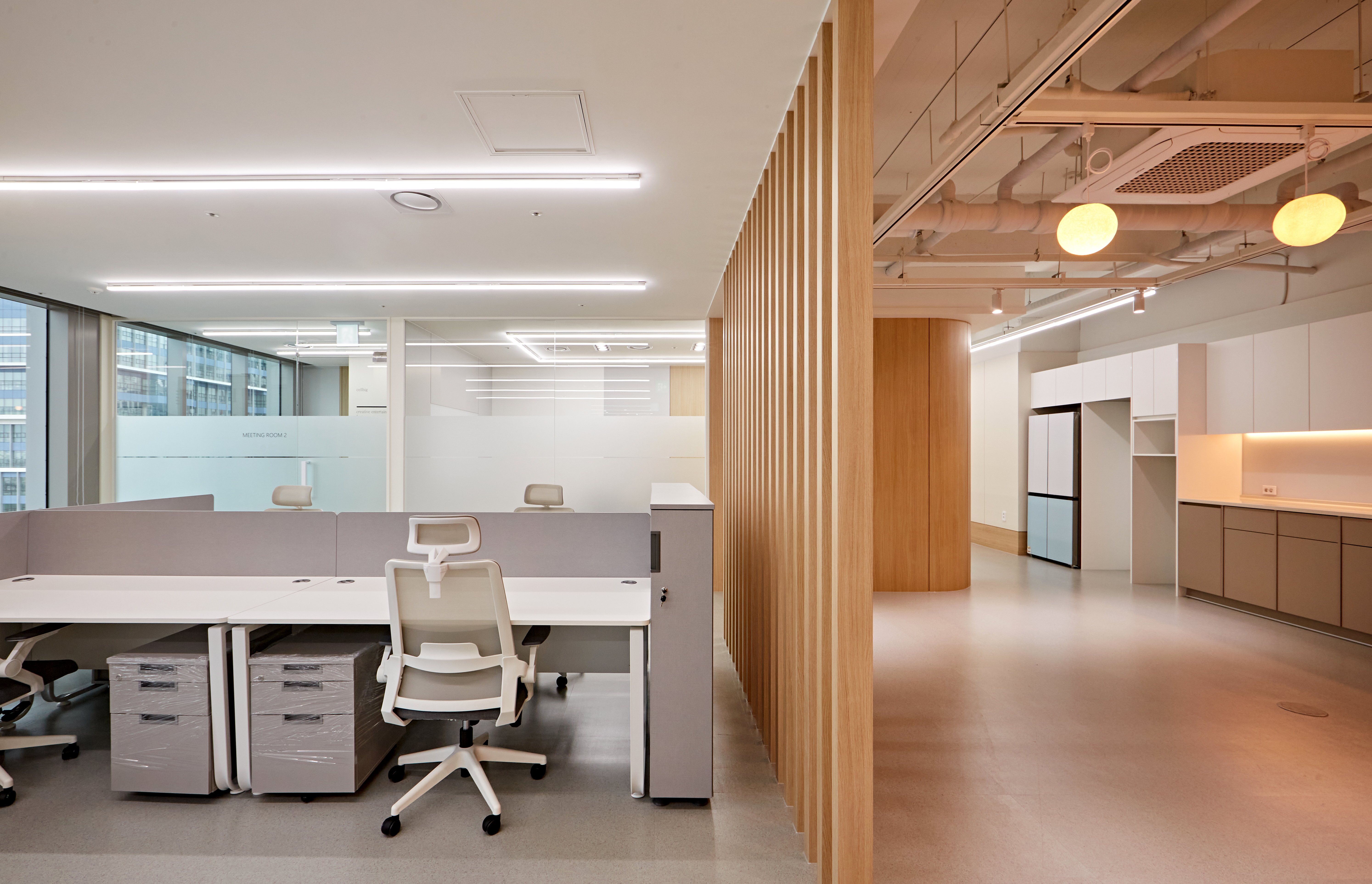 업무 공간과는 분리는 우드 가림막을 통해