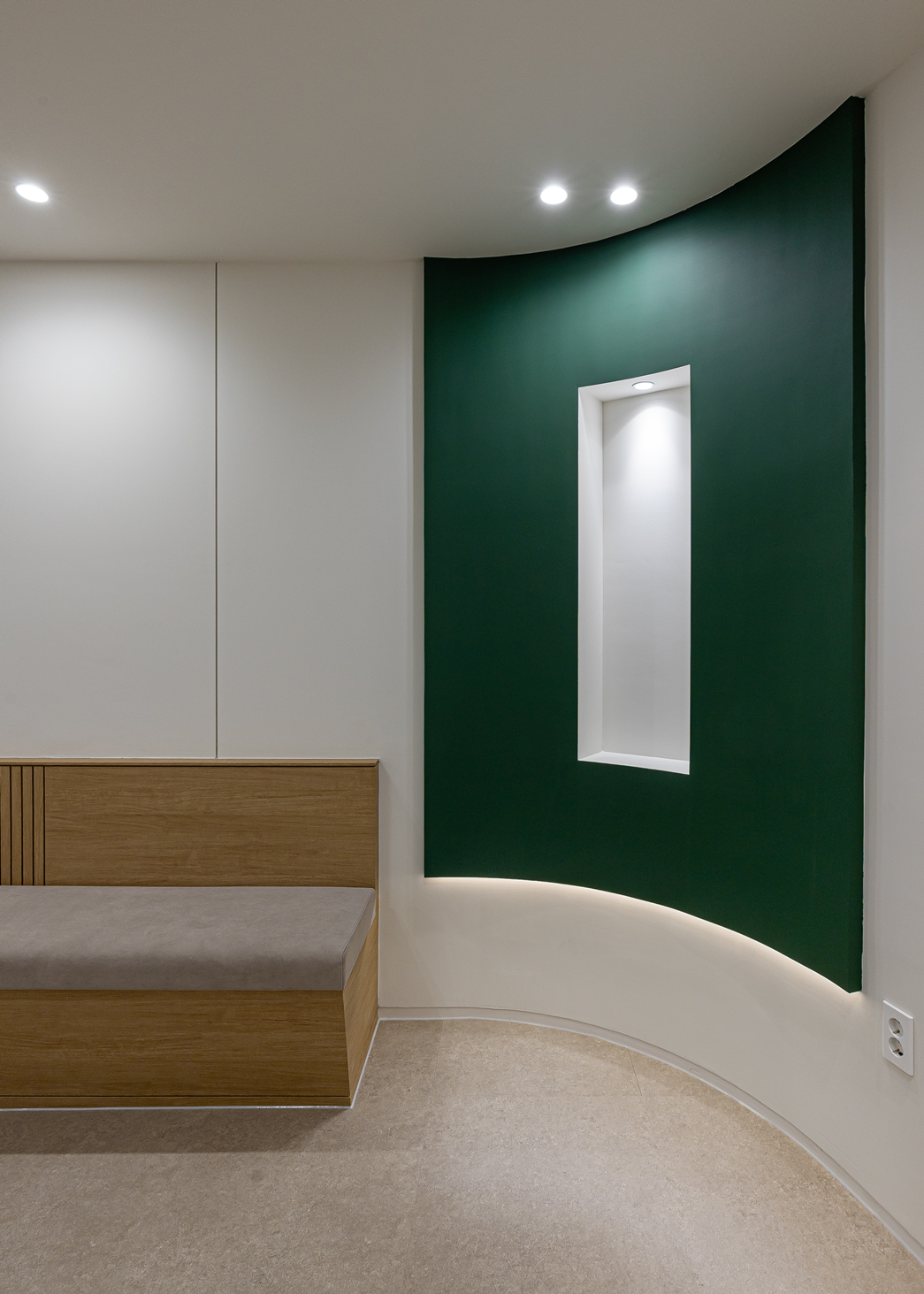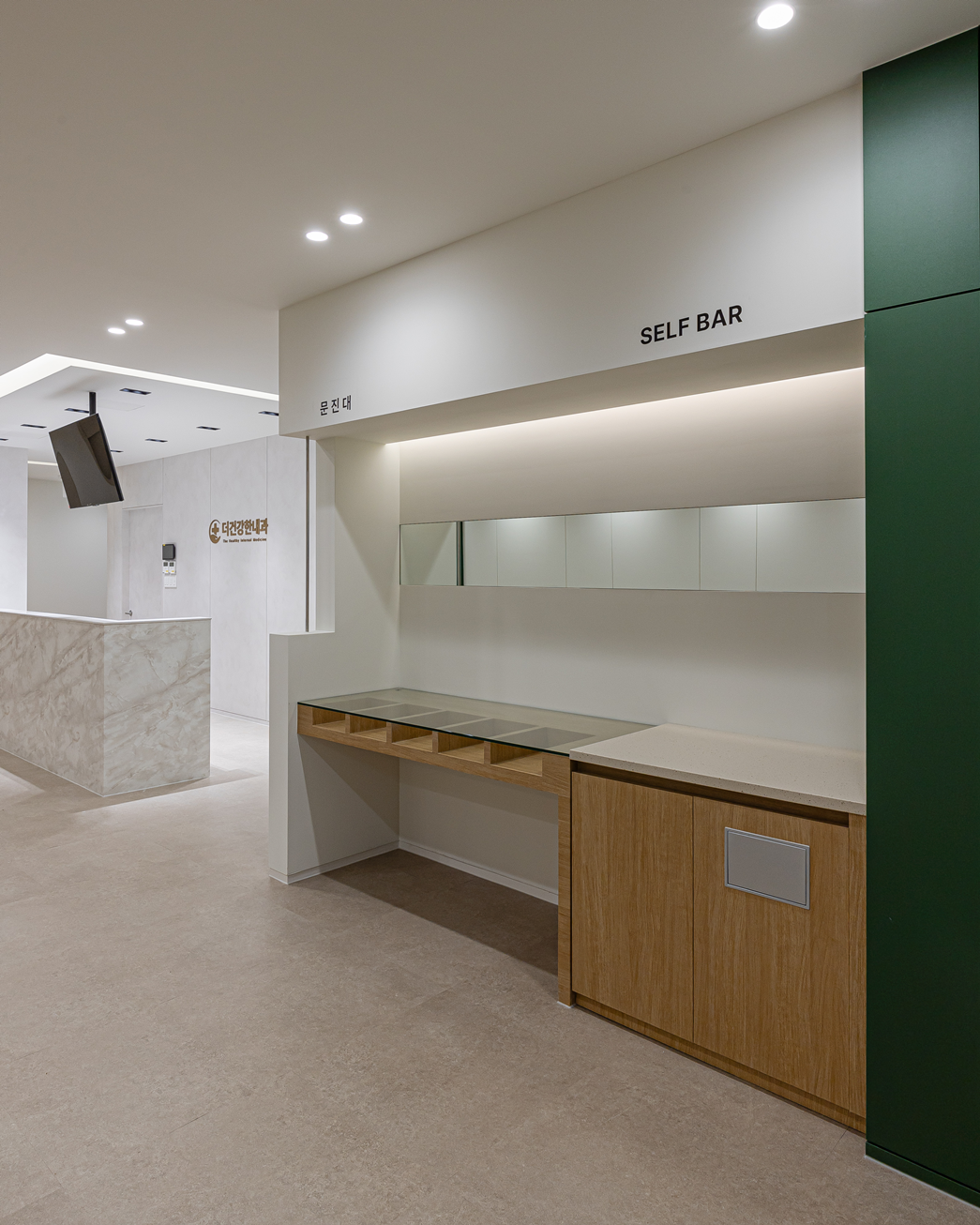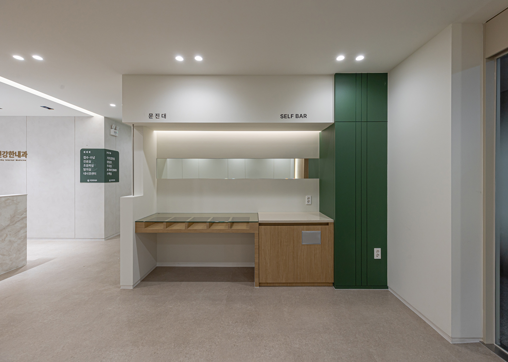 병원 공간은 지나치게 무채색만 사용하면 차갑고 냉정한 느낌을 줄 수 있습니다. 이번 병원 시공에서는 포인트 색상으로 진한 그린 컬러를 선택하여 안정감을 더해 주었습니다. 덕분에 공간 전체가 차분하면서도 단조롭지 않고, 환자와 의료진 모두에게 정서적인 안정감을 제공하는 디자인으로 완성되었습니다.
