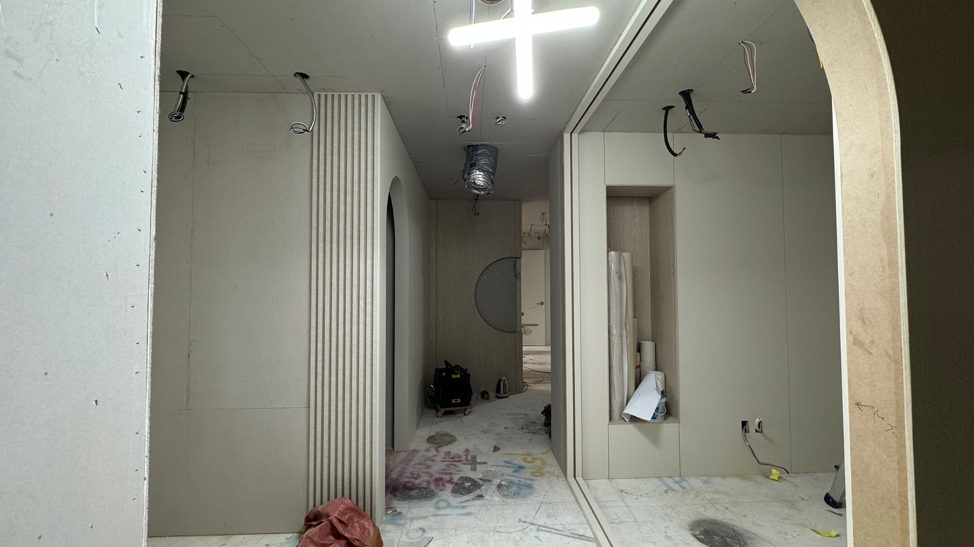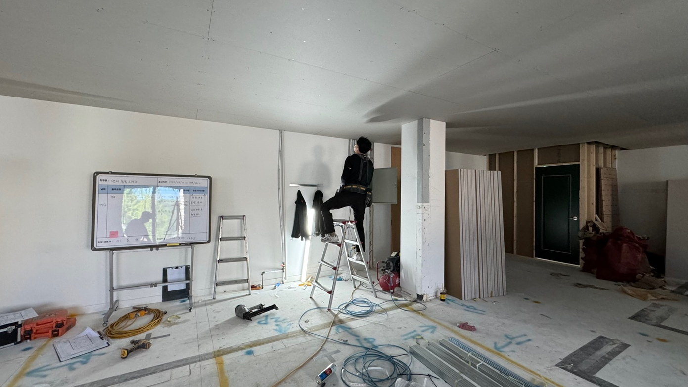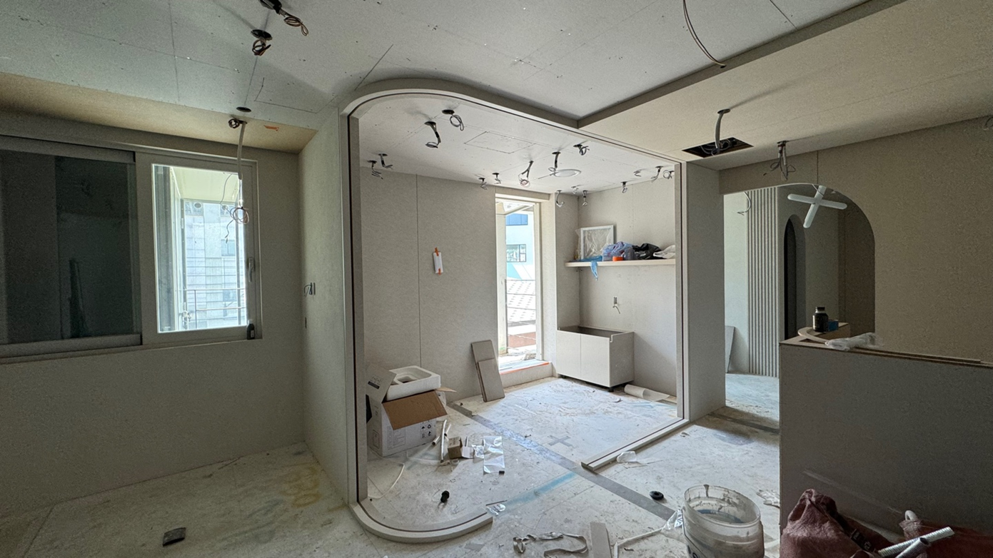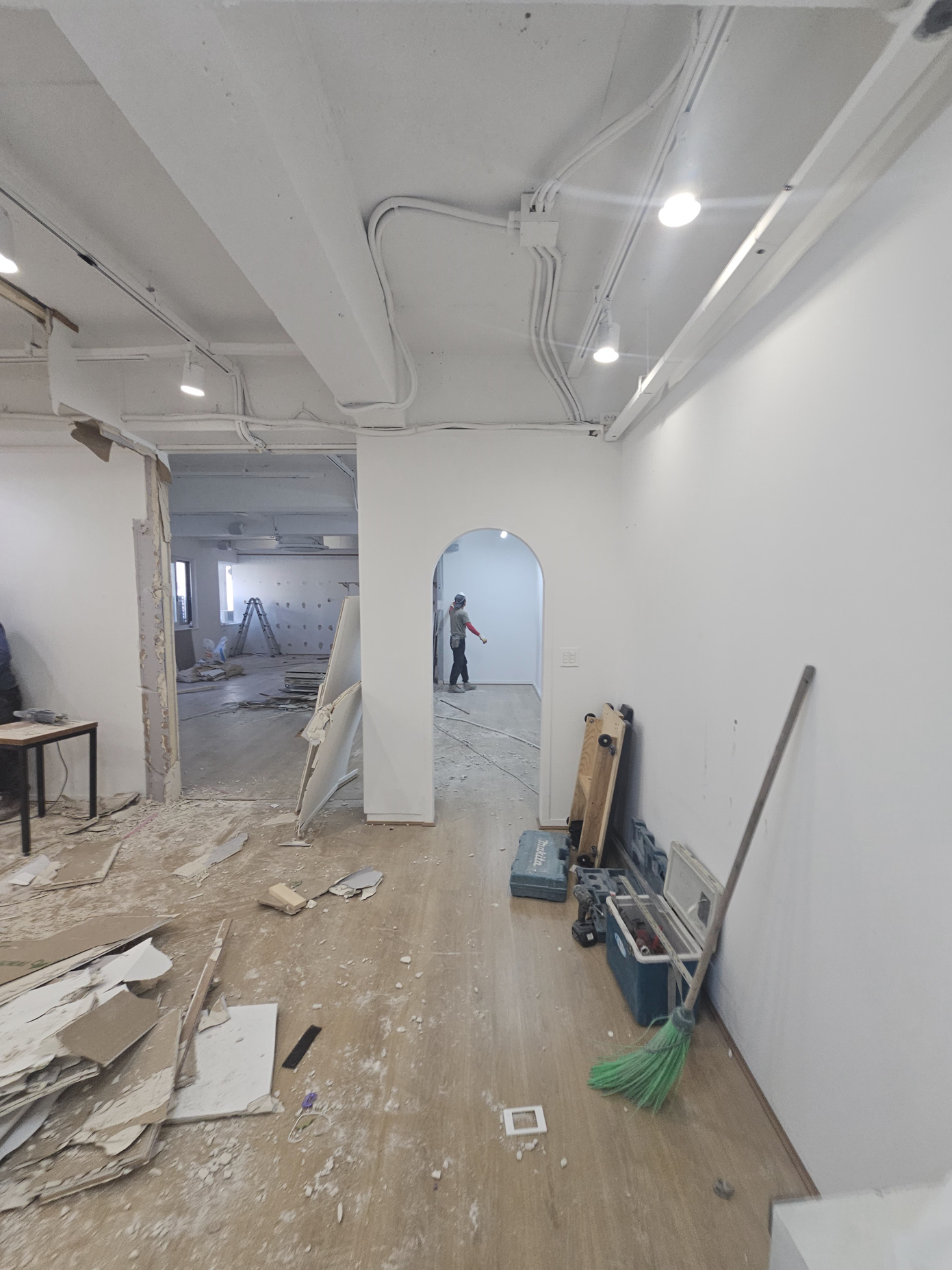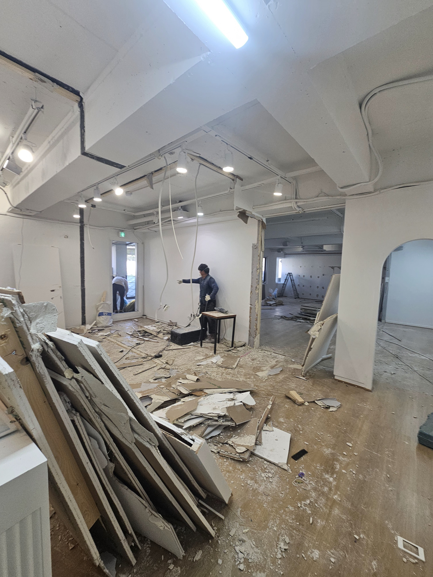 설계가 확정되면 본격적인 공사 시공이 시작됩니다. 기존 공간을 철거하고 새로운 바닥과 벽체 공사를 진행했습니다.