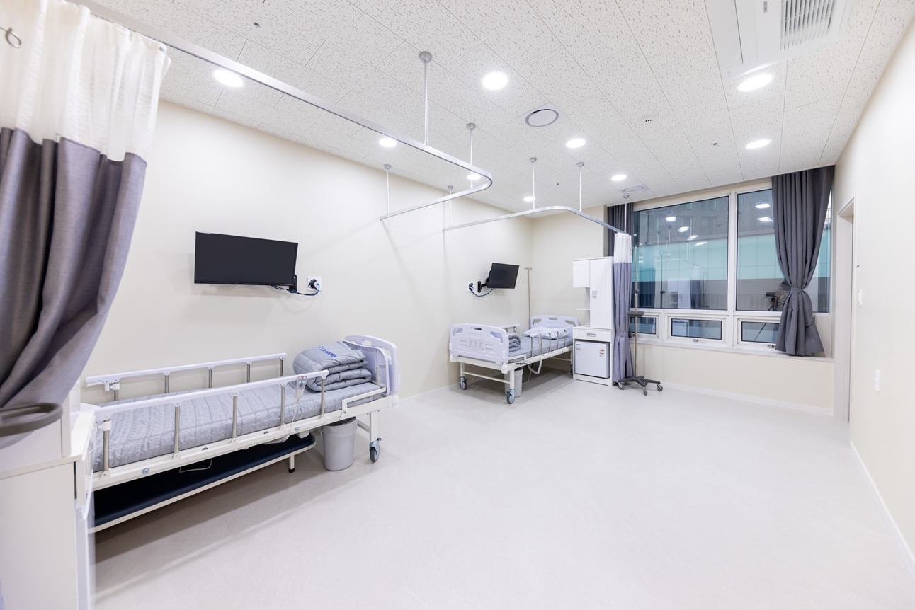 입원실은 차분하고 안정감 있는 분위기가 필수입니다. 전체적으로 화이트 색상으로 통일하고 공간을 환하고 깨끗하게 연출하였습니다. 또한 1인실과 2인실, 다인실 등 다양한 입원실을 구성하여 환자들의 편의까지 고려하였습니다.