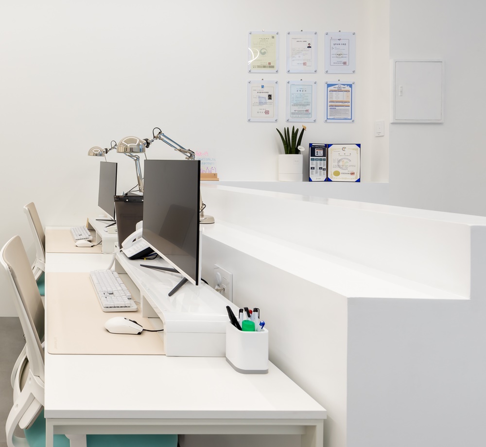 화이트 벽면에 투명한 액자 배치는 대표님의 전문성을 시각적으로 즉각 전달하며 방문객에게 깊은 신뢰감을 줍니다.