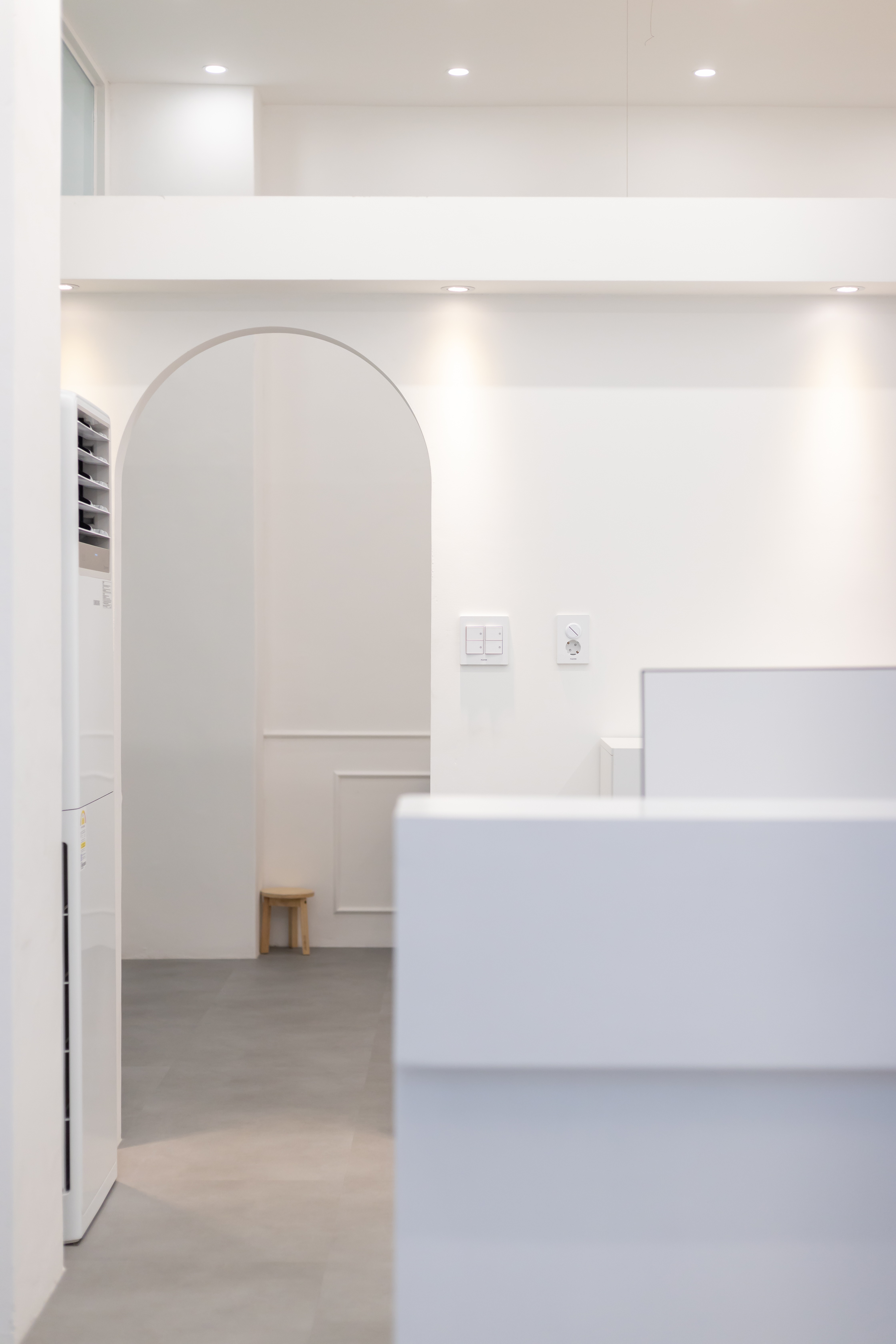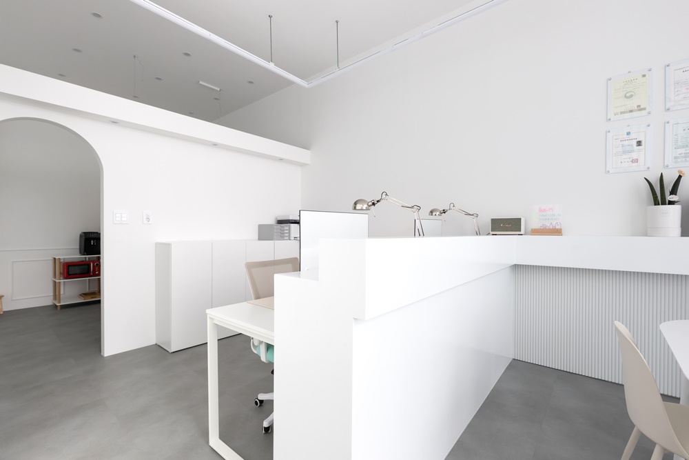 특히 입구에서 들어왔을 때 가장 먼저 마주하는 상담 공간 뒤편으로 아치형 게이트를 배치하여 부드러운 통로 라인을 구축했고요.