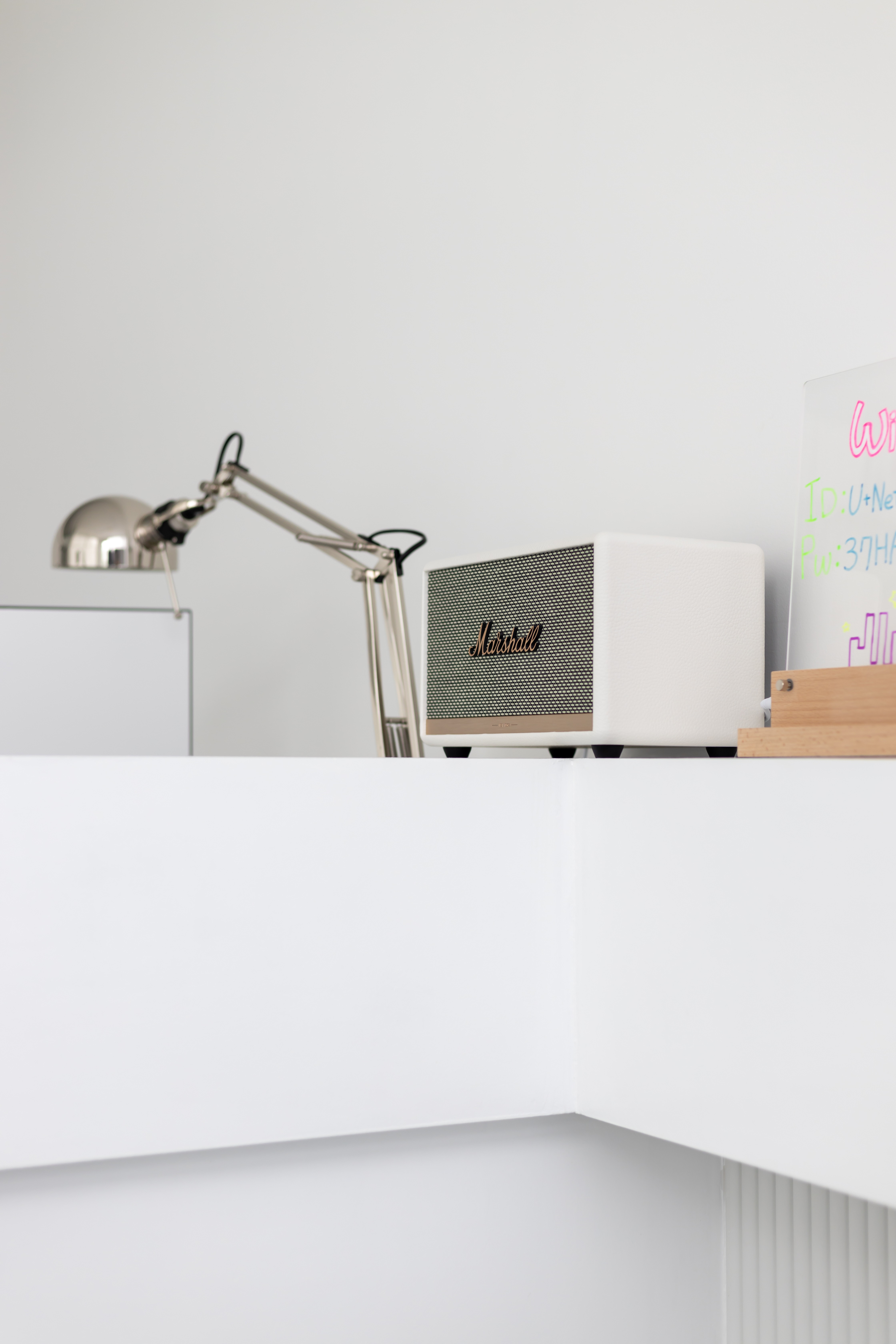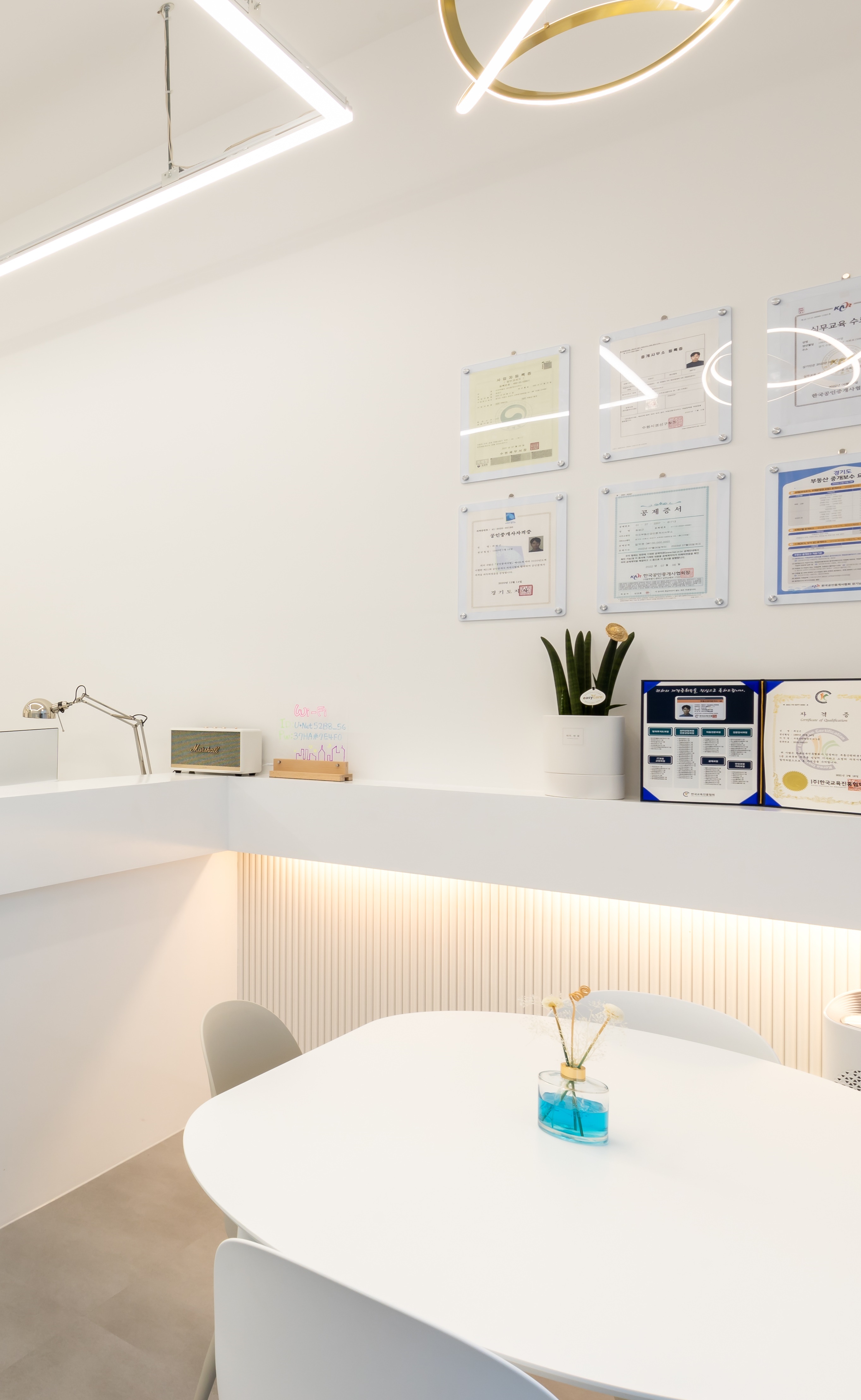 데스크 위에는 업무 중에도 쾌적한 환경을 유지할 수 있도록 화이트 톤의 마샬 스피커와 작은 화분, 각종 자격 증명서들을 감각적으로 배치하여 고객에게 신뢰를 주는 디스플레이를 완성했죠.