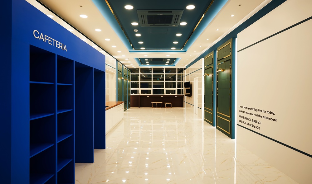 파란색과 초록색, 흰색의 대비가 골드 소재와 만나 이토록 조화로울 수 있다는 것을 보여주는 이번 현장은, 모든 공간이 하나의 스토리로 연결되어 입체적인 감동을 선사하는 부산사무실인테리어의 완결판이라 할 수 있습니다.