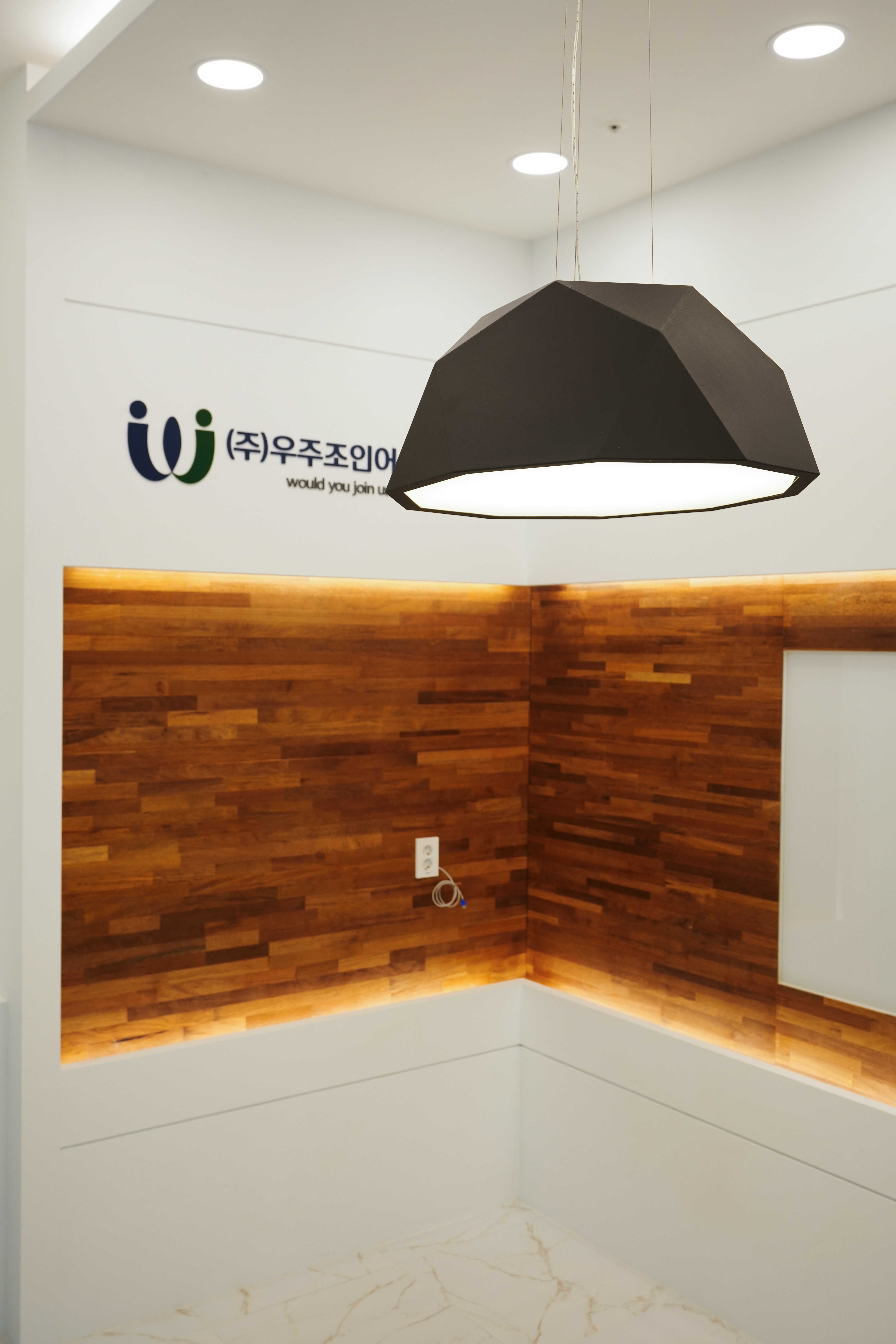 회의실 내부는 따뜻한 우드 텍스트의 벽면과 화이트보드, 그리고 하단의 간접 조명이 조화를 이루어 집중력을 높여주는데요.