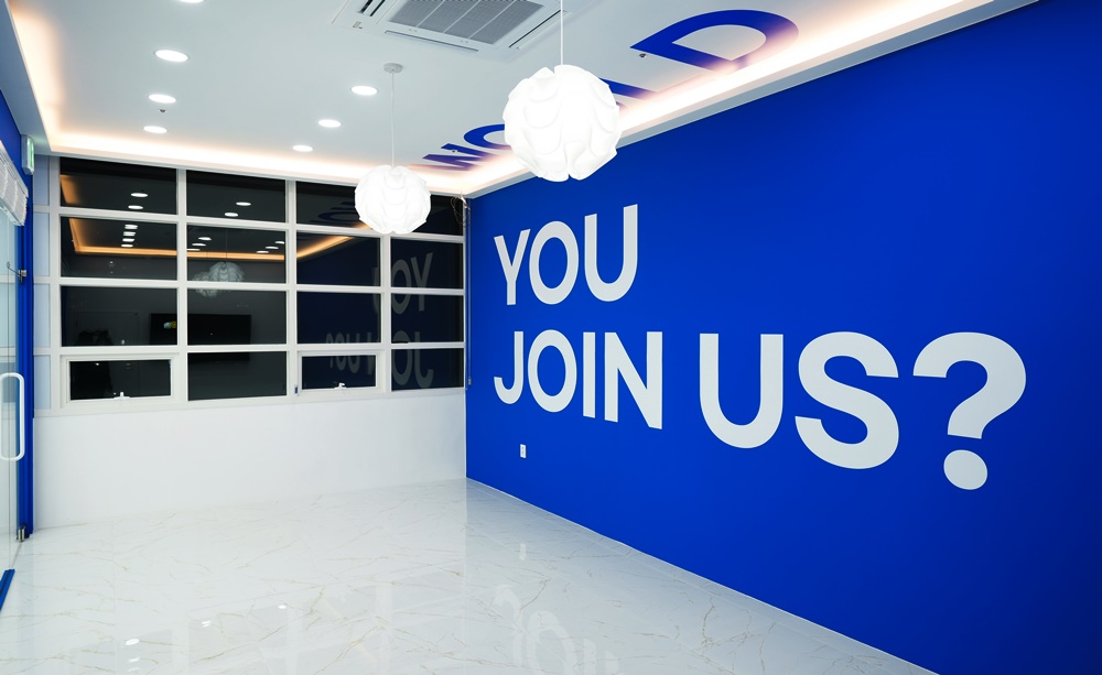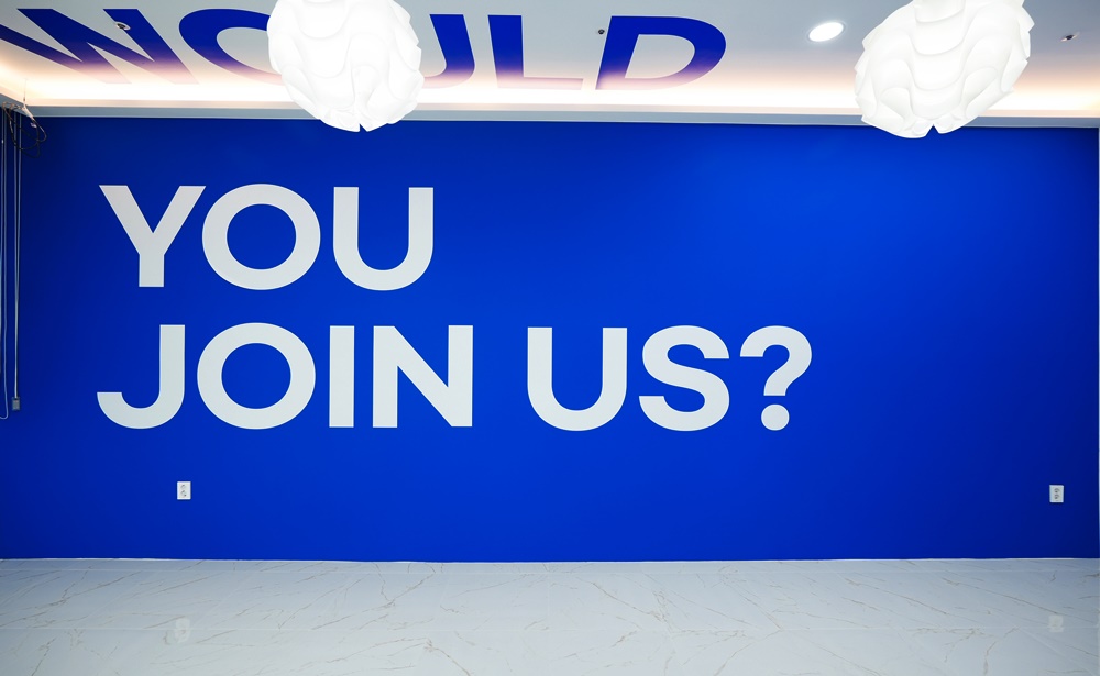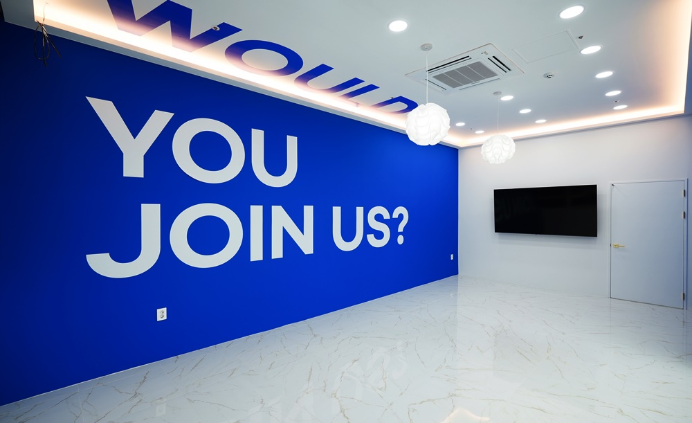 "YOU JOIN US?"라는 대형 타이포그래피는 입구 전면뿐만 아니라 복도 안쪽 벽면에도 강렬한 블루 배경 위에 화이트 텍스트로 배치되어 방문객들에게 잊지 못할 첫인상을 남겨주는데요.