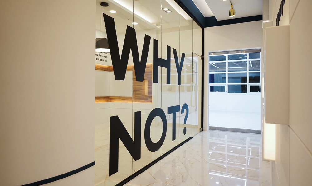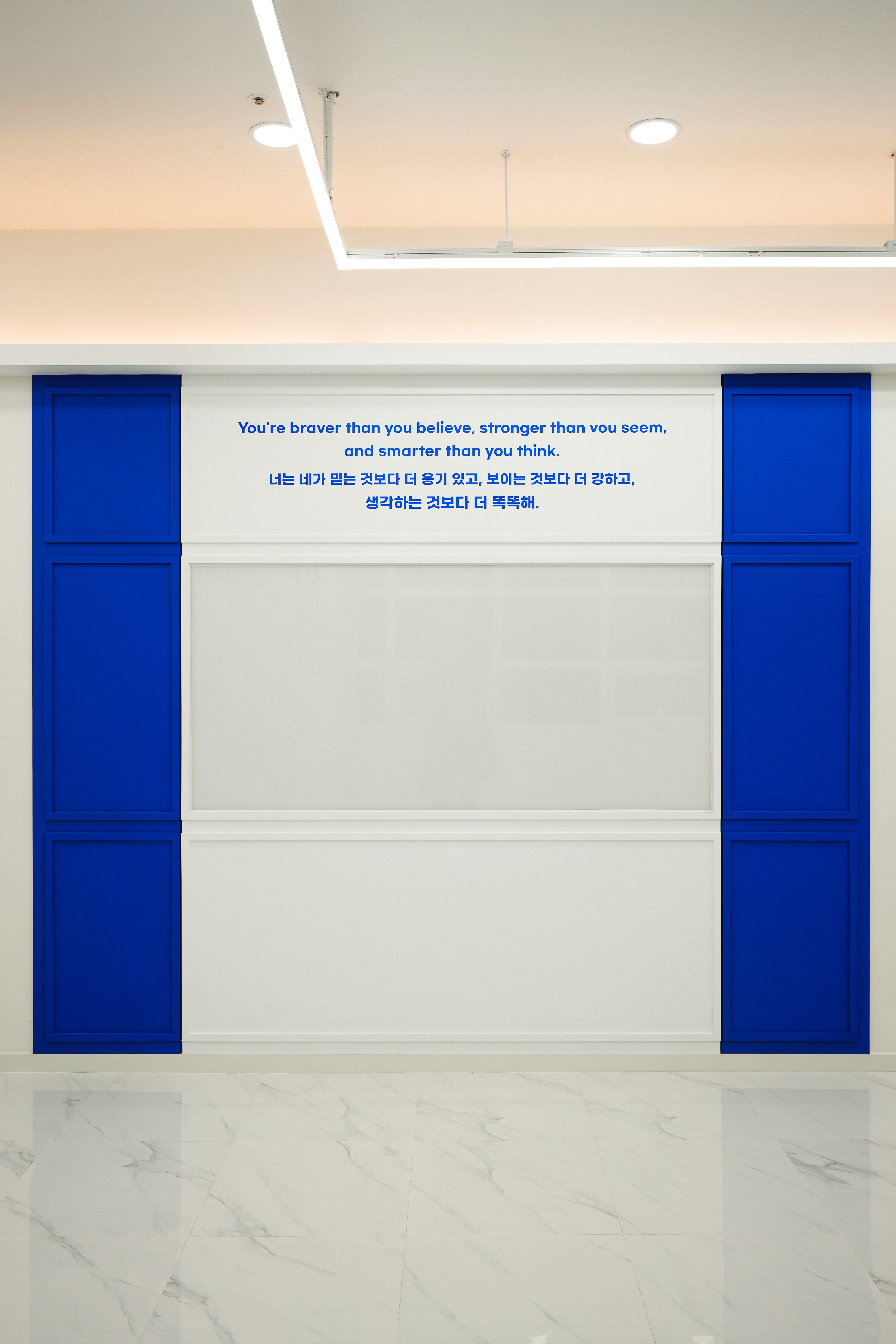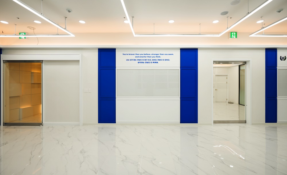 가벽 상단에는 "You're braver than you believe..."라는 응원의 메시지가 블루 톤으로 정교하게 시공되어 직원들에게 심리적인 안정감과 동기를 부여하는데요.