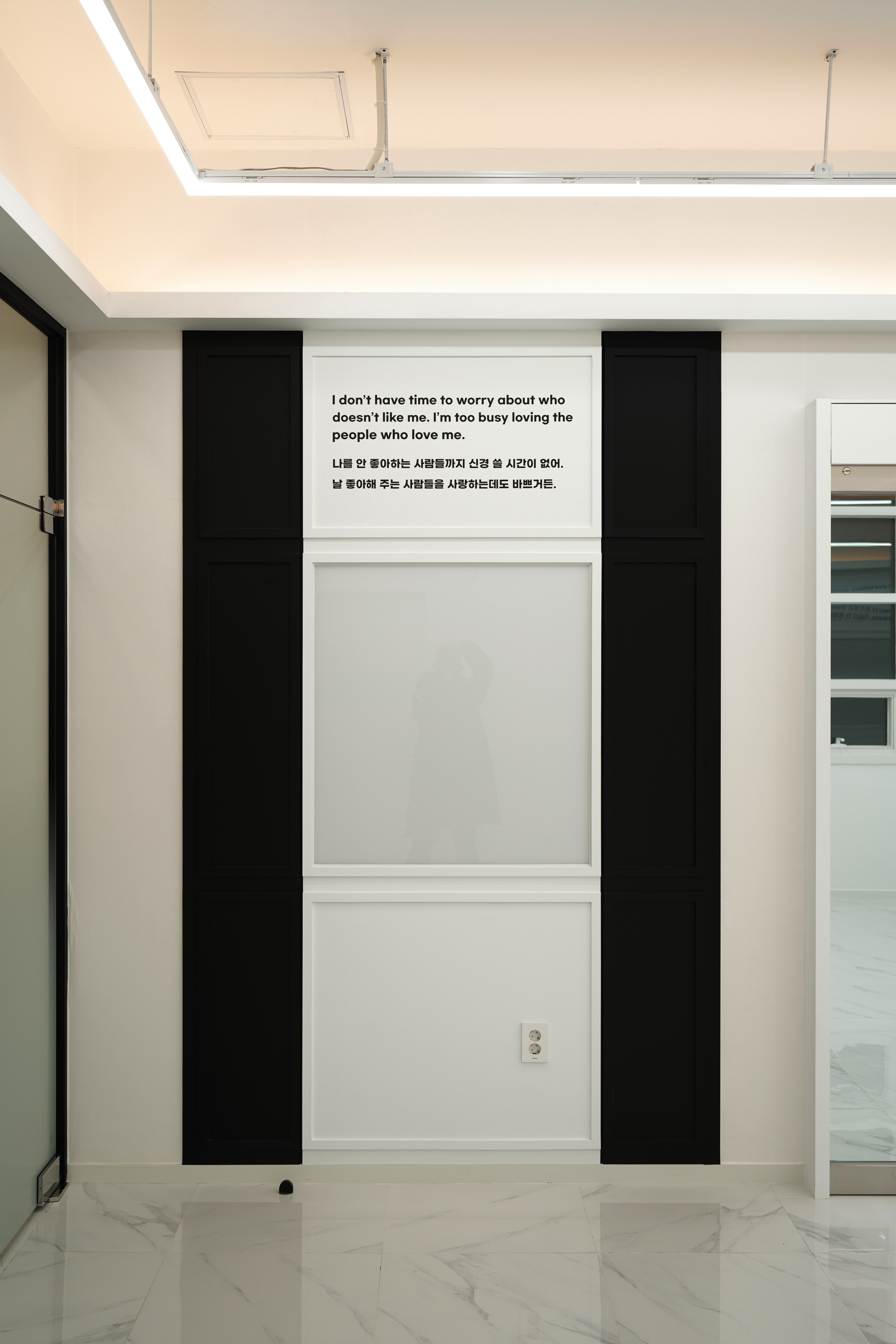 복도 끝에는 "Learn from yesterday..."로 시작하는 의미심장한 문구가 한글과 영문으로 벽면에 디자인되어 공간에 철학적인 깊이를 더해주는데요.