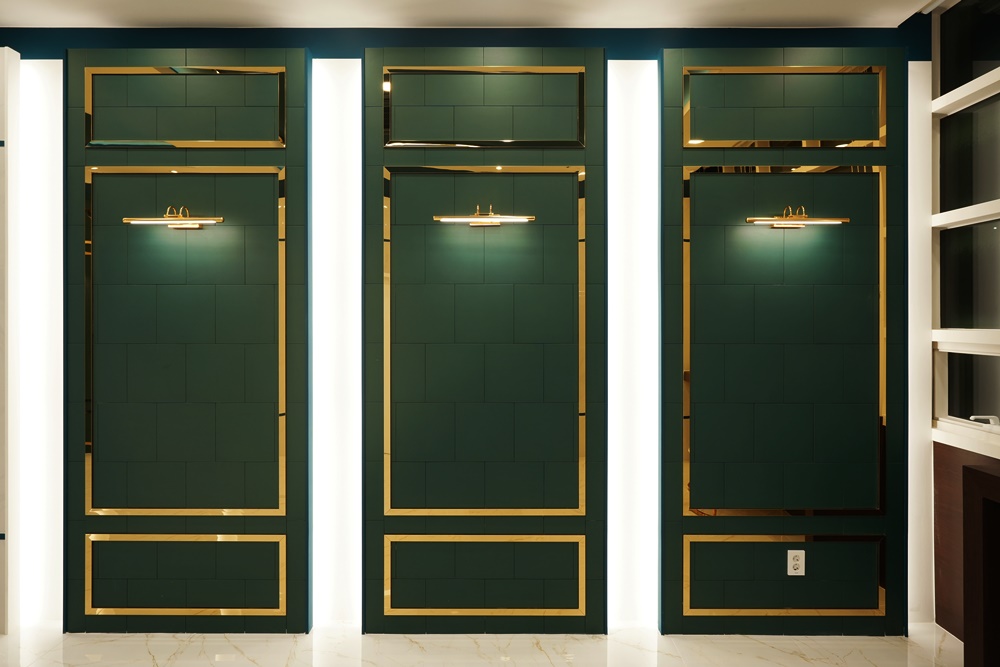 복도 측면에는 딥그린 컬러의 웨인스코팅 벽면이 길게 이어지는데, 각 패널마다 골드 프레임으로 마감하여 클래식하면서도 럭셔리한 분위기를 연출했답니다.