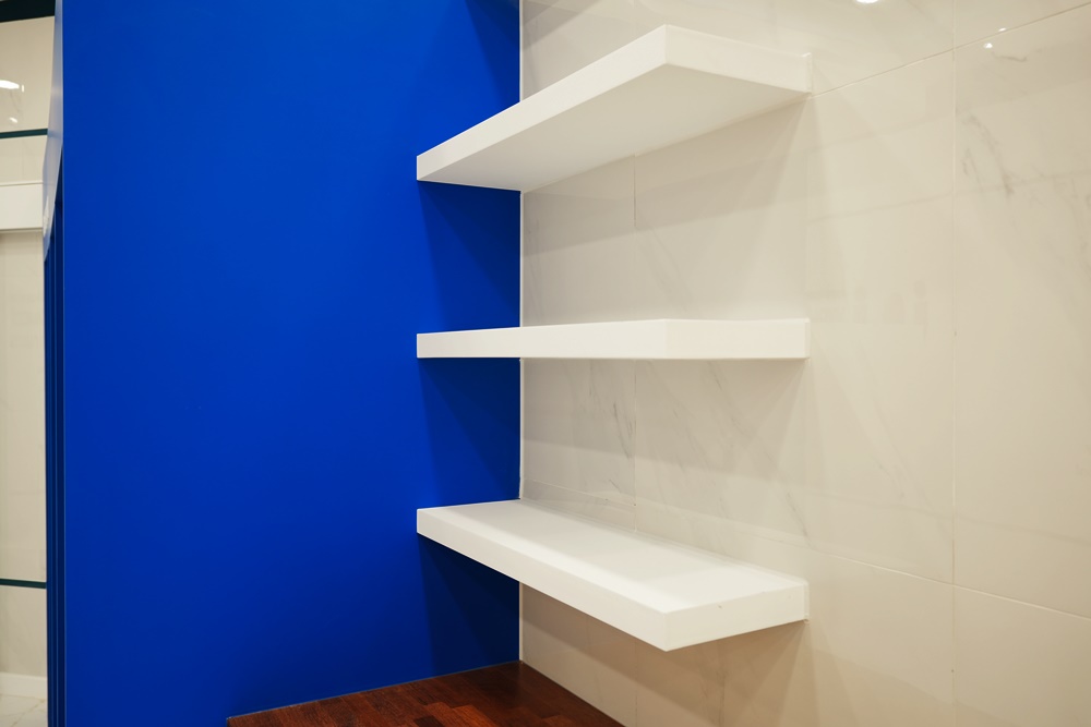 강렬한 코발트블루 컬러로 제작된 맞춤형 수납장은 오픈형 선반 구조로 설계되어 실용성을 극대화했는데요.