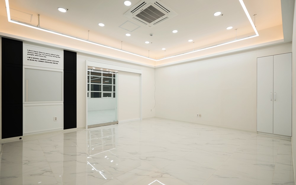 은은한 대리석 패턴이 깔린 광택 바닥이 천장의 무수히 많은 매립등을 반사하며 공간을 더욱 넓고 화사하게 만들어줍니다.
