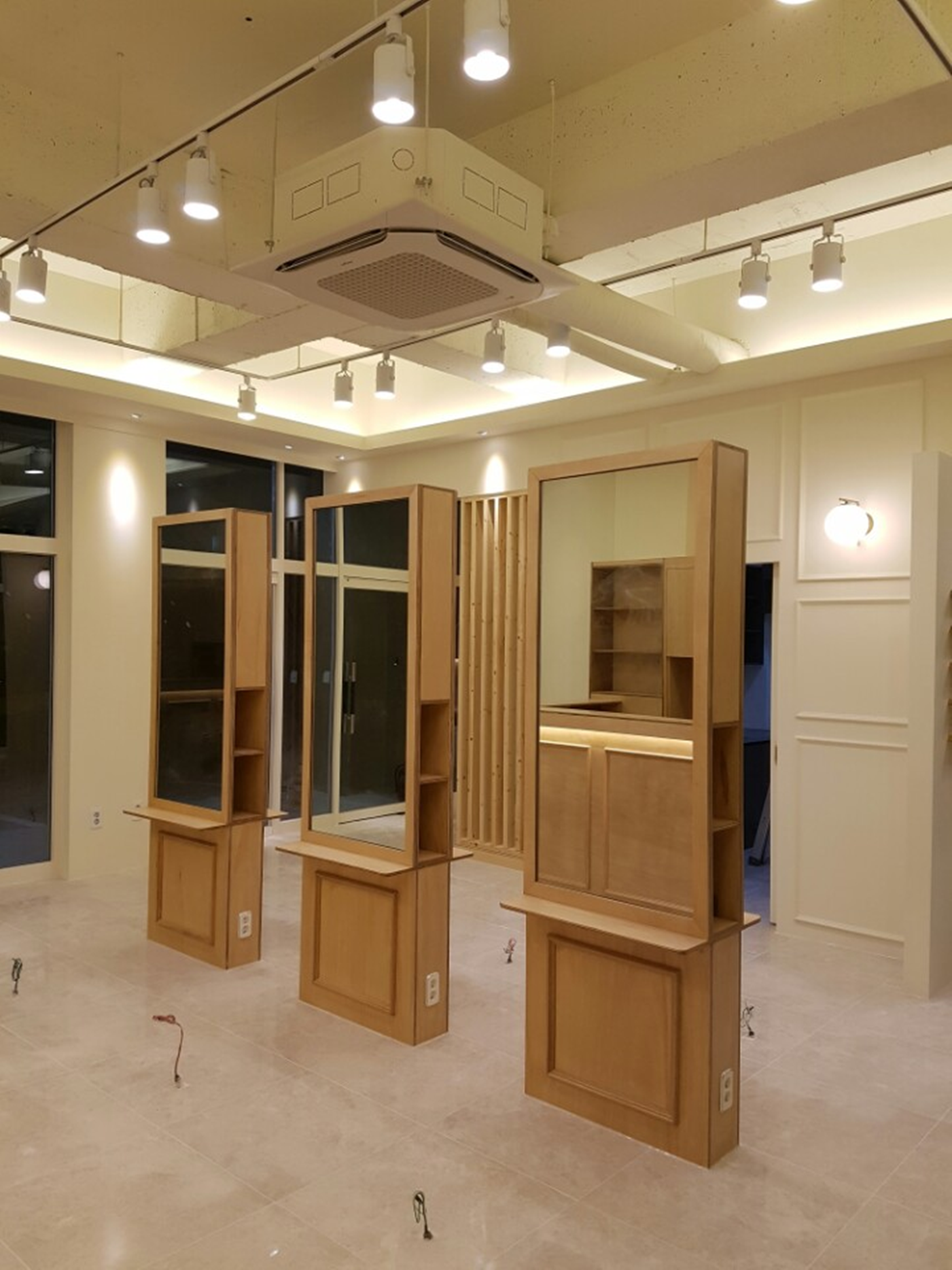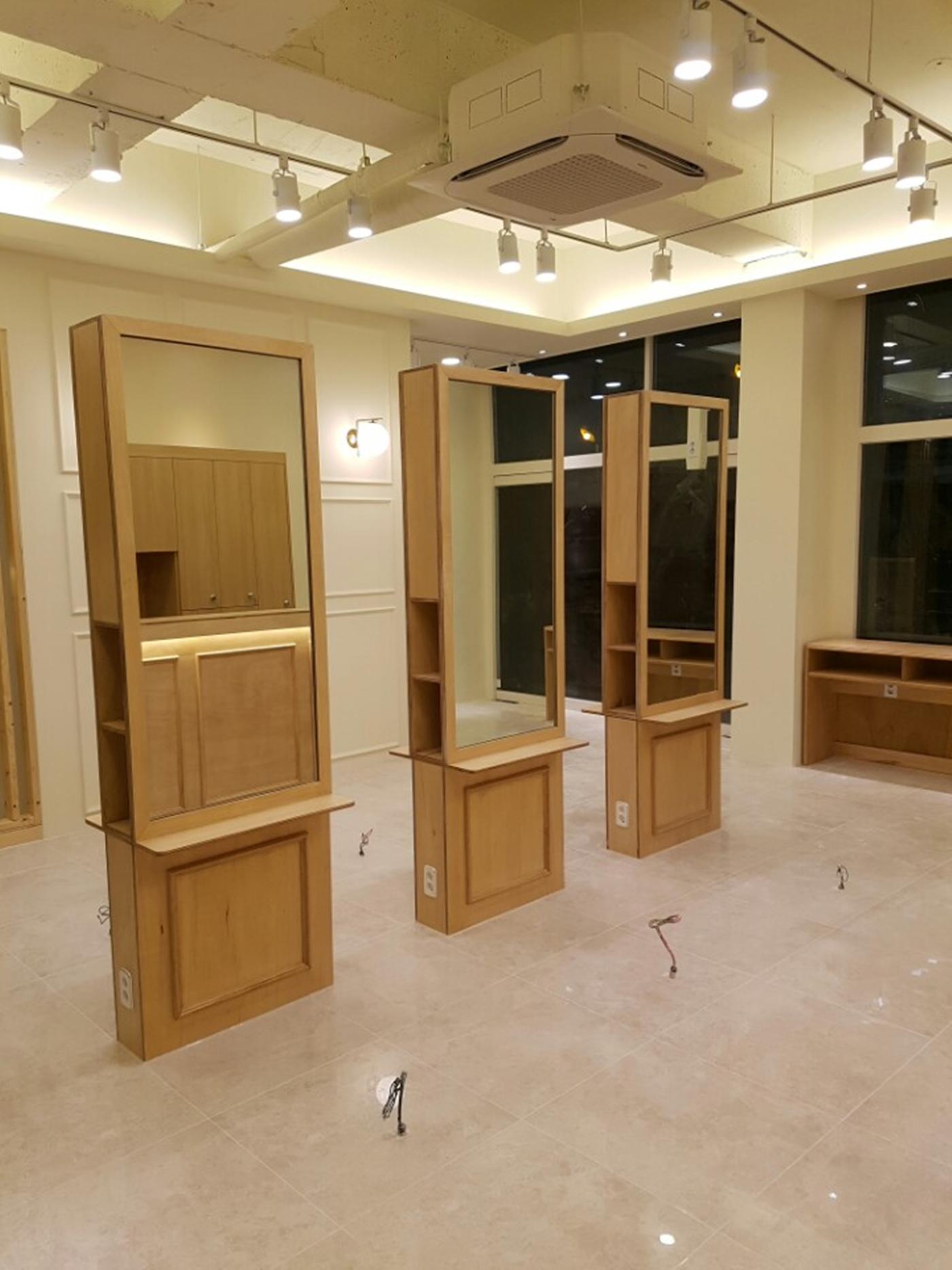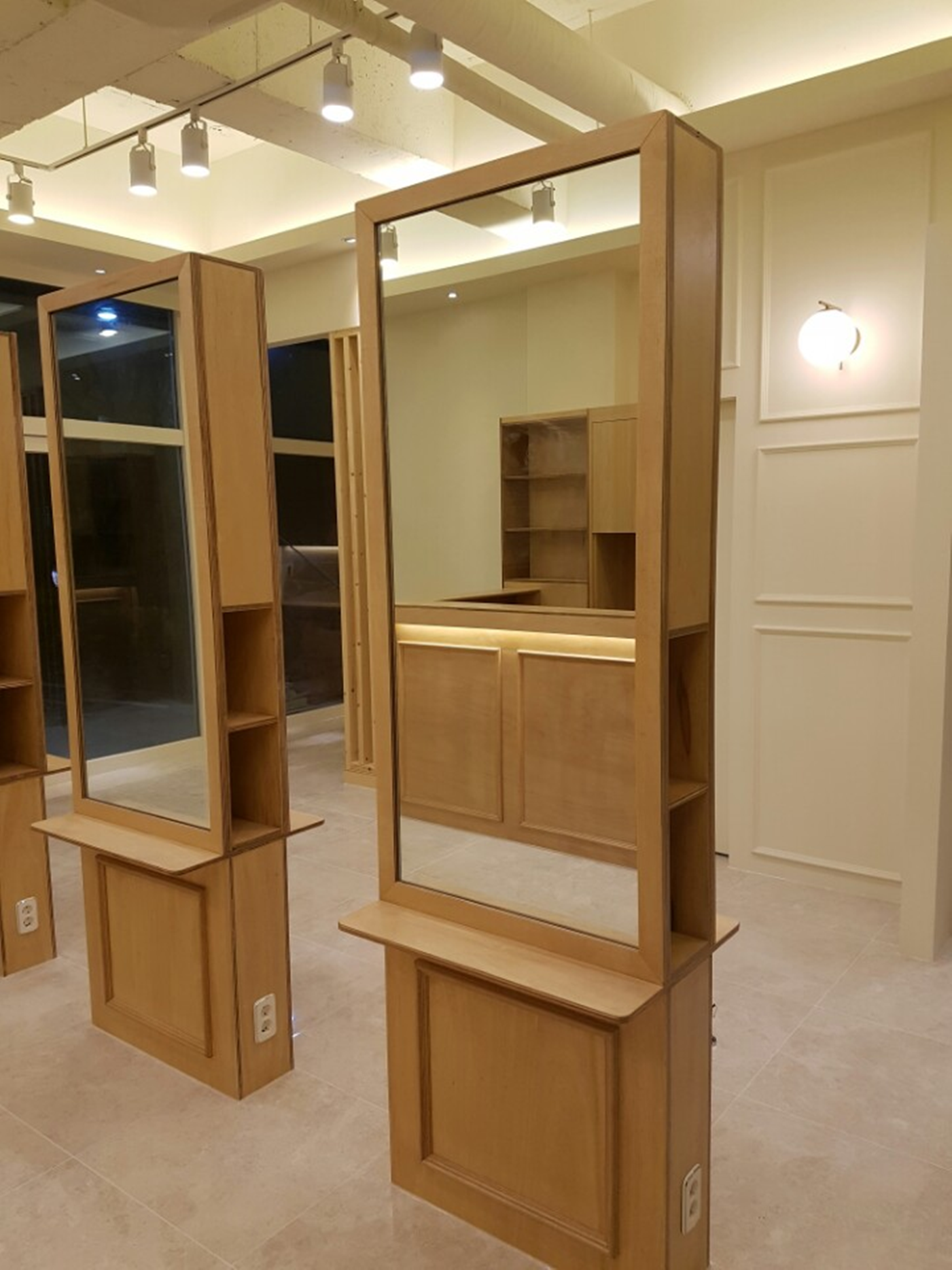 중앙에 세워진 미용 거울은 벽면이 아닌 독립형 파티션 형태로 제작하여