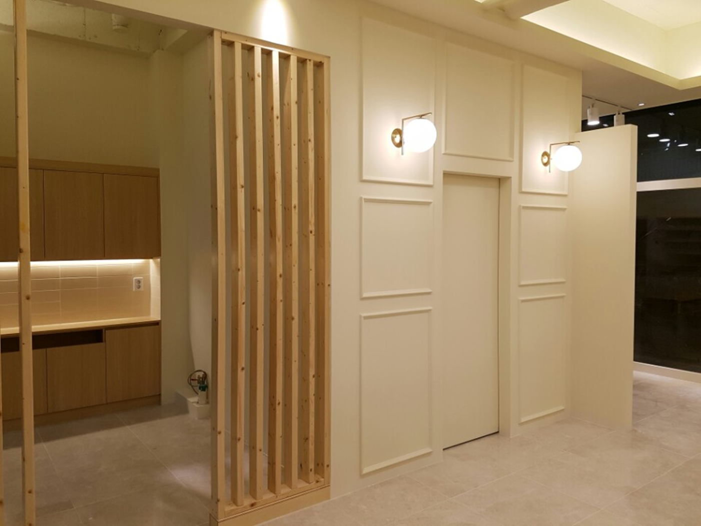 입구에 들어서면 가장 먼저 눈에 들어오는 것은 밝은 우드 마감으로 통일된 공간연출입니다.