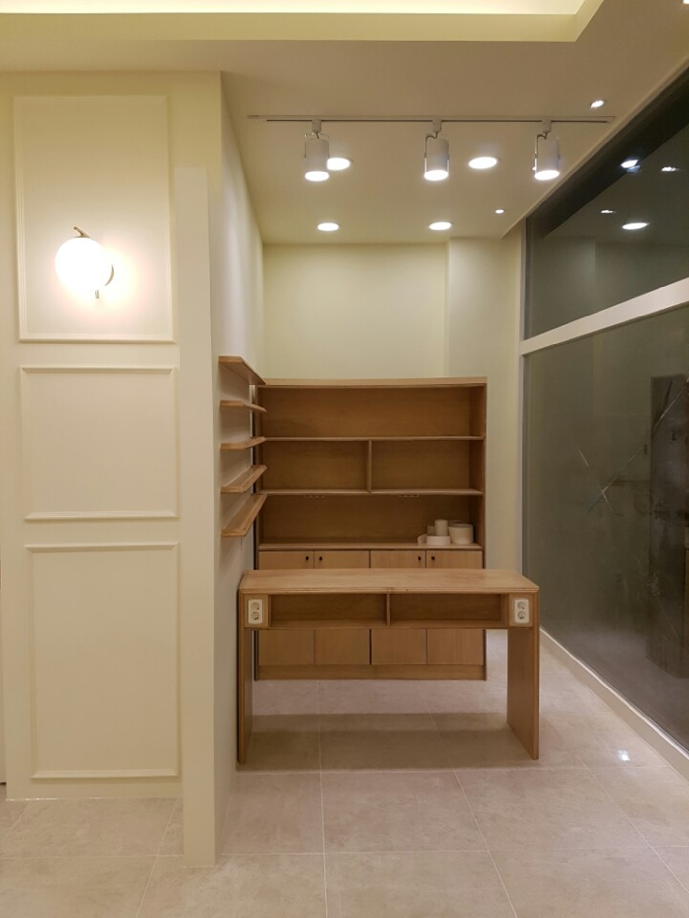 리셉션 공간은 목공 작업으로 직접 제작한 카운터와 수납장이 중심입니다.