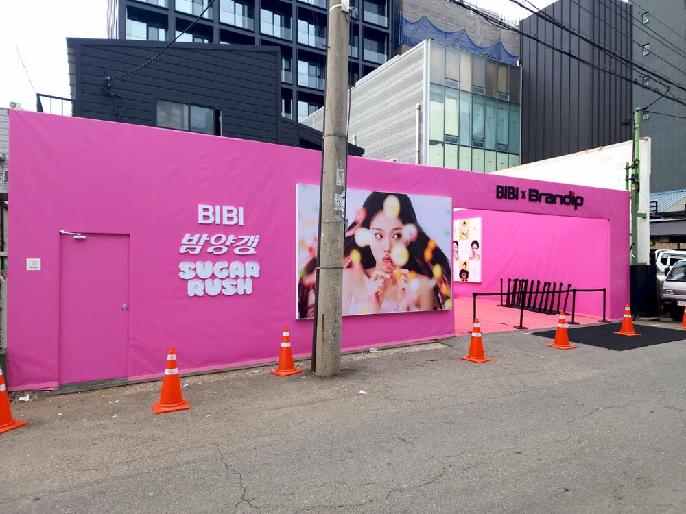 내외부의 선명한 핑크 벽면은 사람들의 시선을 단번에 붙잡으며 대형 아티스트 포스터가 브랜드와의 협업임을 명확히 드러냈어요.