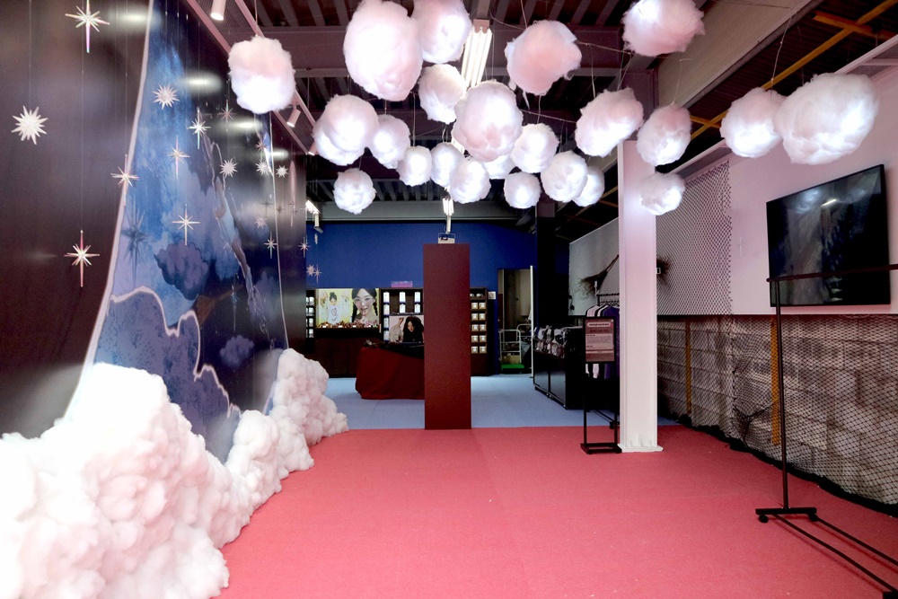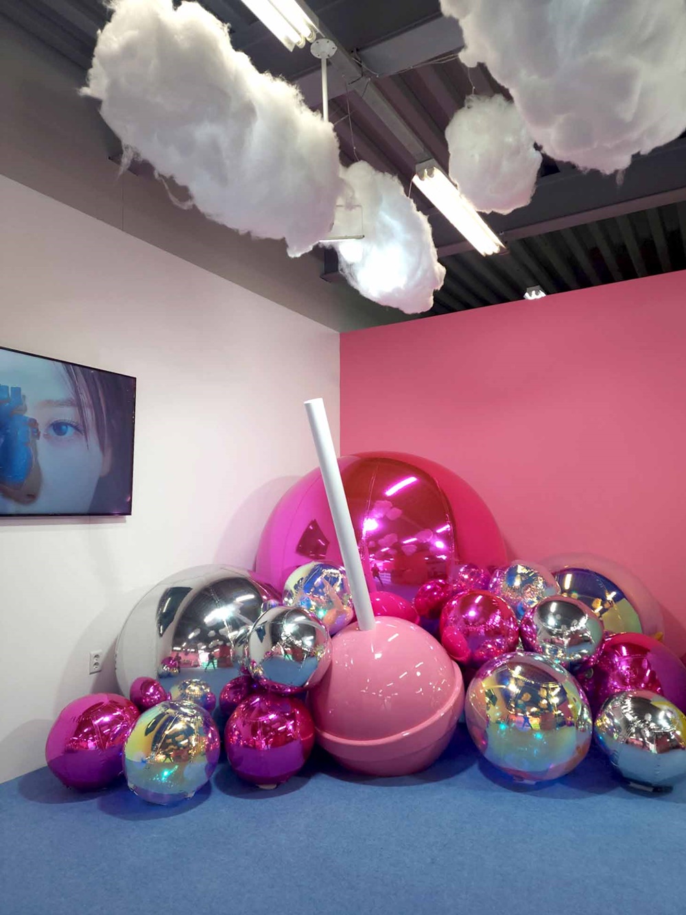 실내 중심에는 대형 풍선과 은은하게 떠 있는 구름 모티브가 천장에 배치되어 몽환적이면서도 생동감 넘치는 분위기를 조성해요.