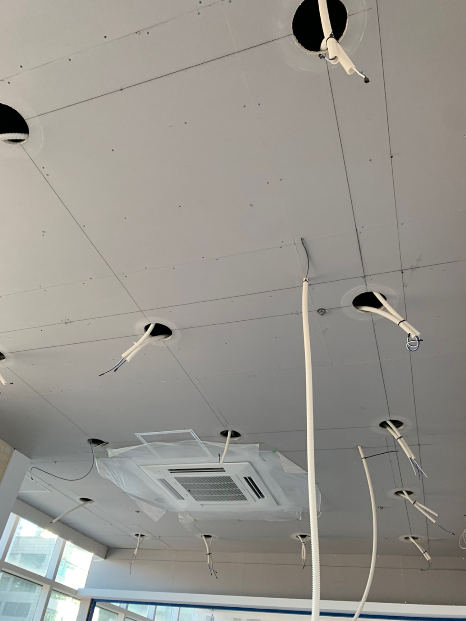 회의실의 천장에는 마찬가지로 매립등과 유니크한 조명이 조도를 확보해주고 있으며 시스템에어컨을 매립시공하여 편의성을 갖추었습니다.
