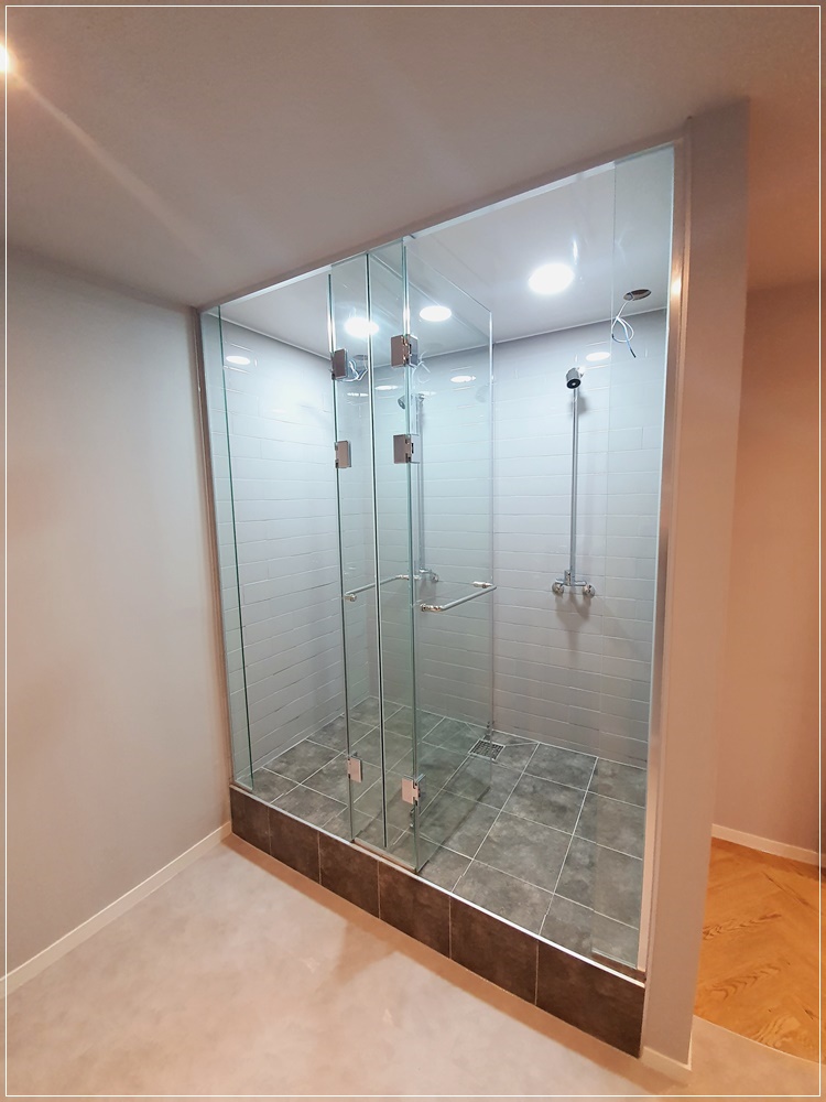 샤워실의 모습입니다. 3D 도안에서 소개해드렸던 샤워실은 차분하고 문양이 정갈하게 배치가 되어있어서 고객들의 심신을 달래 수 있는 공간으로 보였을 것입니다. 그러나 이런 부분은 클라이언트의 요구와 저희의 디자인적 감각의 조율을 통해서 깔끔한 분위기의 샤워실을 만들어 보았습니다.