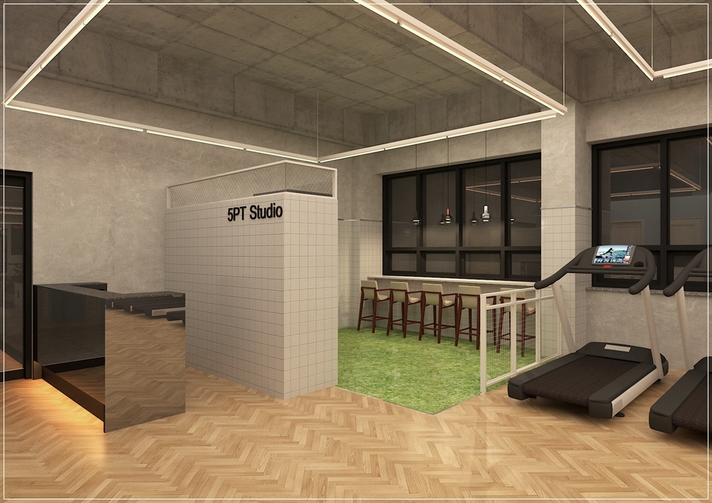 바닥 같은 경우는 3D 도안에서는 모르셨겠지만 유광 코팅 소재를 사용하여서 어두워보일 수 있는 피트니스 샵이 한층 더 밝게 보일 수 있도록 하였습니다. 이처럼 섬세한 디자인의 작업은 저희 916 디자인만의 인테리어 특성이기도 합니다.