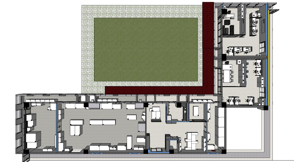 150평형이나 되는 공간을 효율적으로 채우기 위해서는 우선 배치가 가장 큰 고민이었습니다. 그래서 클라이언트분과 상의하여서 필요한 공간과, 필수적으로 배치하고 싶은 곳이 있는지 그리고 각각의 크기는 어느정도를 고민하시는지등을 디테일하게 잡아나갔는데요.