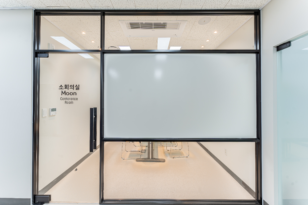 소회의실은, 대회의실과 마찬가지로 창의 중앙부분은 시야를 가려주어 집중도를 높였습니다. 그리고 미니멀한 분위기를 위해 도어는 블랙 프레임으로 제작되었고, 사무실과 다른 바닥재를 사용하여서 공간의 분리를 확실히 도와드렸습니다.