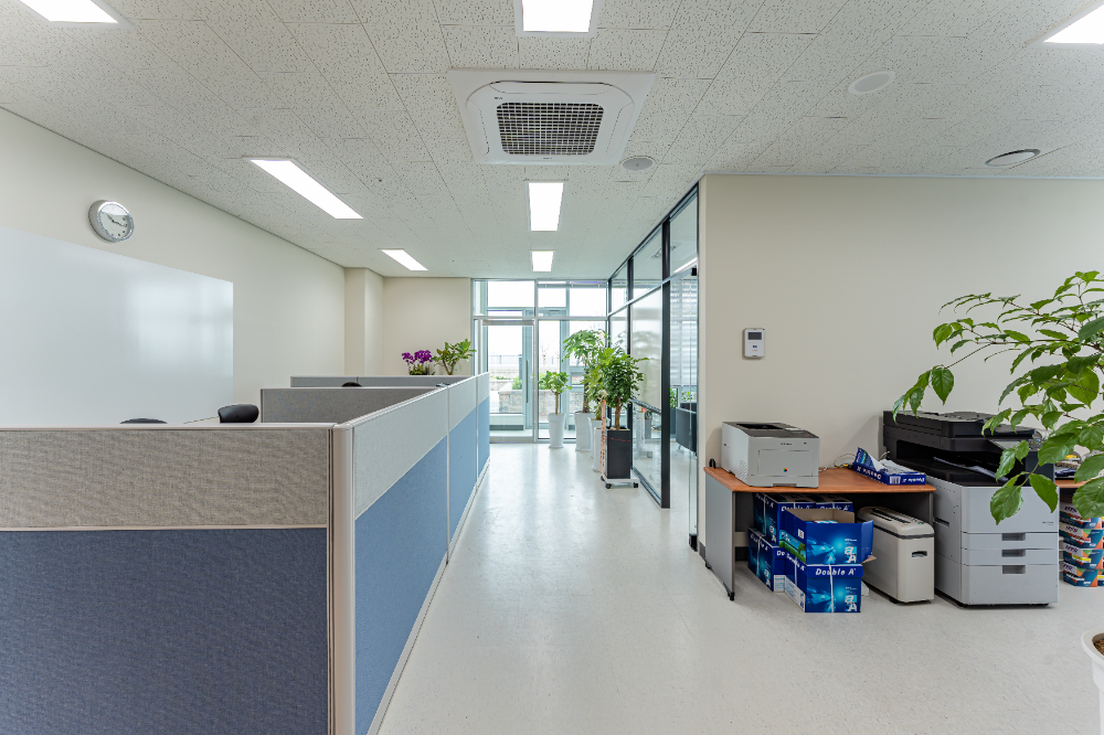 내부로 들어서면 단정하게 정리되어있는 사무실인테리어를 만나보실 수 있습니다. 이번 부천 레노부르크 지식산업센터인테리어는 합리적인 비용으로 깔끔한 사무실을 만드는데에 집중하였는데요. 그레이와 블루컬러의 파티션으로 각각의 프라이버시를 존중할 수 있는 구성을 도와드렸고, 깔끔한 바닥과 천장에는 LED 조명을 균일하게 배치하여 정적인 분위기를 연출하였습니다.