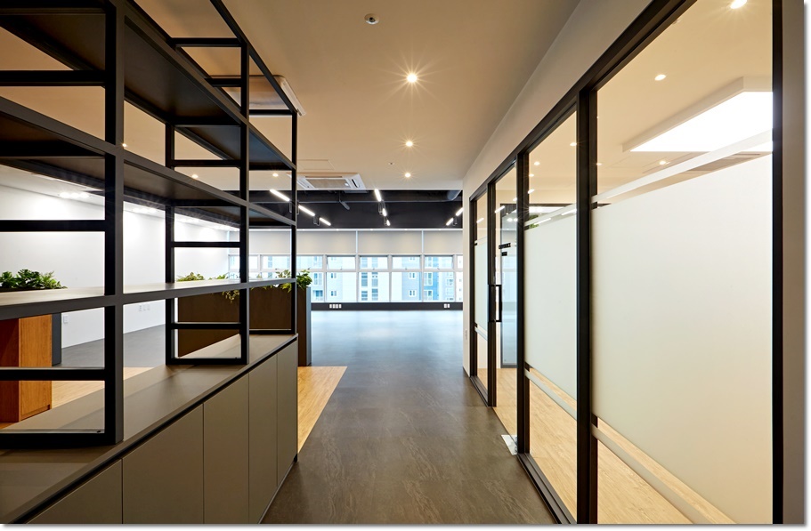 통합형 공용사무공간은 블랙 컬러의 노출천장과 라인조명을 시공해 높은 층고와 충분한 조도를 확보했고 그 외 탕비실, 회의실, 대표실은 화이트 컬러의 덱스천정에 매입형 조명을 시공해 깔끔하고 밝아 보이도록 함으로써 쾌적한 환경을 유지할 수 있도록 했습니다.