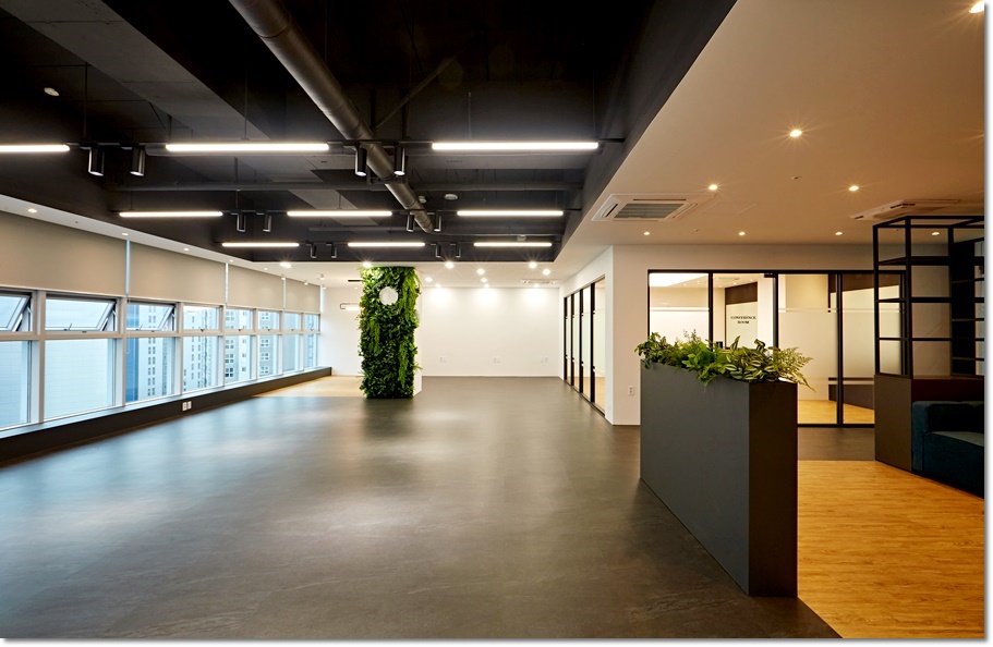내부는 회의실, 카페테리아, 사무공간, 대표실로 구성됐고 입구측에 가벽으로 분리한 회의실을 제외하고는 모두 통합형으로 조성해 넓게 활용할 수 있도록 했습니다. 다만, 카페테리아는 가벽을 세우지는 않았지만 바닥 마감을 달리하고 낮은 파티션형 화분을 경계에 두고 공간을 분리함으로써 영역성을 명확히 하면서 개방감을 확보하도록 했답니다.