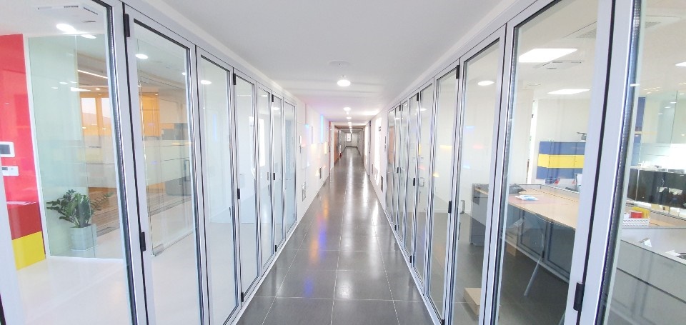 폴딩도어가 시공된 모습입니다. 멀리서 보면 복도이지만 가까이 보면 유리로 된 문 덕분에 공간이 넓어 보이고 폴딩 도어는 문을 열면 90% 이상 열리기 때문에 양쪽 문을 모두 열어두면 마치 한 공간처럼 사용할 수 있어 최근에는 주거공간, 상업공간, 사무공간 할 것 없이 많이 사용되고 있습니다.