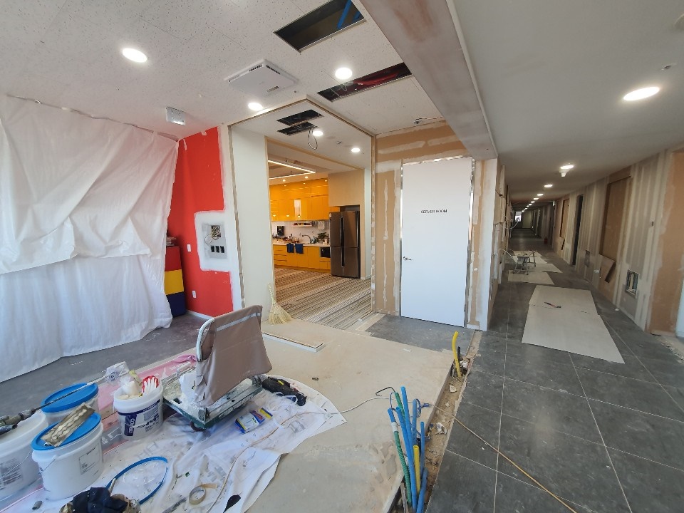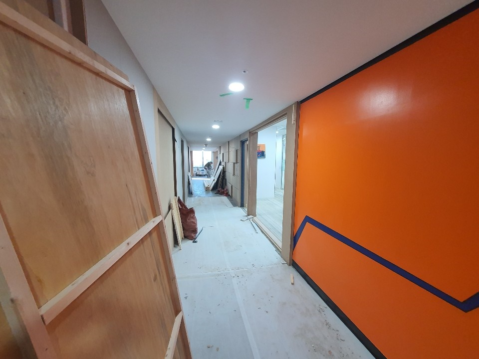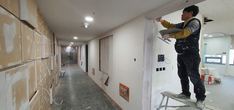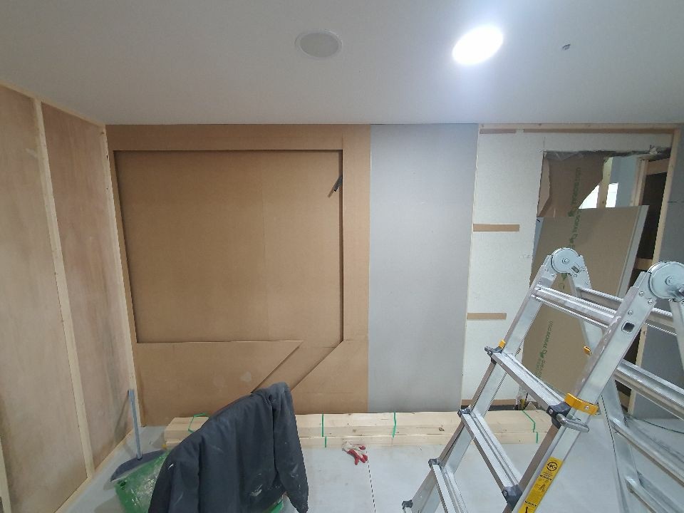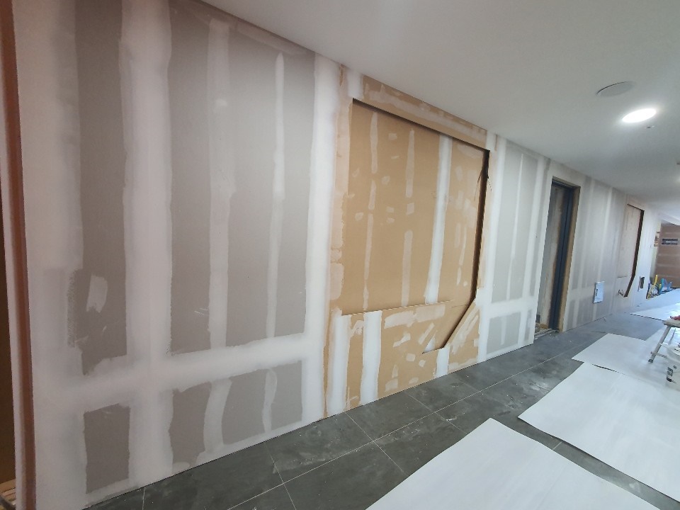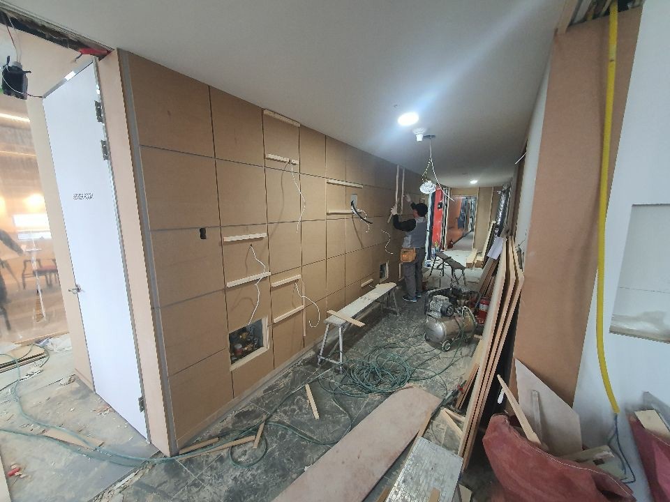 복도 벽과 입구 시공 중입니다. 다소 복잡한 디자인이었기 때문에 굉장히 공을 들여 시공을 했는데요, 최종적으로 나올 모습이 기대되는 작업이었습니다.