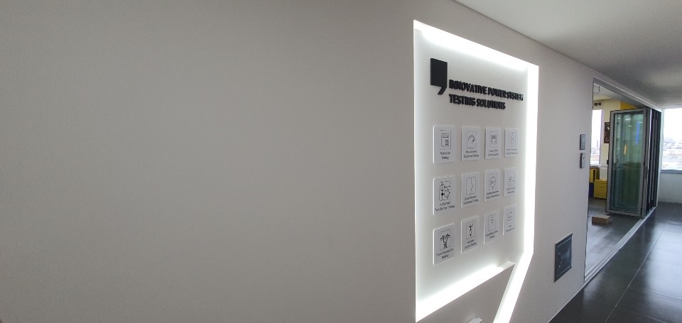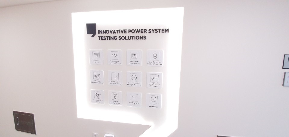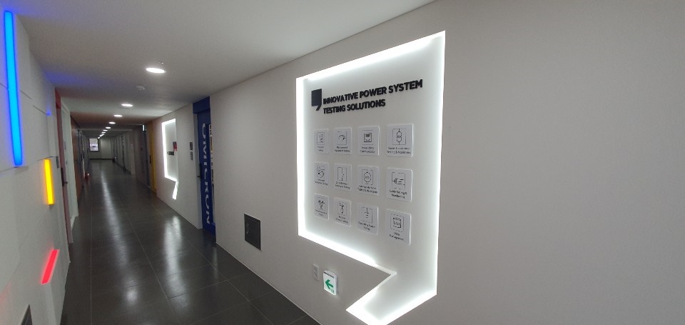 전체 분위기를 보면 벽면은 화이트톤으로 도장했고 바닥은 그레이톤으로 마감해 극명한 모노톤의 깔끔한 분위기를 조성하고 있습니다. 조명은 천장에 매입등을 시공해 깔끔한 디자인을 유지하고 있고 벽면 디자인에 컬러 간접등을 시공해 포인트를 줬으며 단차를 줘 회사 로고를 활용한 따옴표 디자인을 시공해 회사명과 자료 등을 부착해 정체성을 확립시켰습니다.