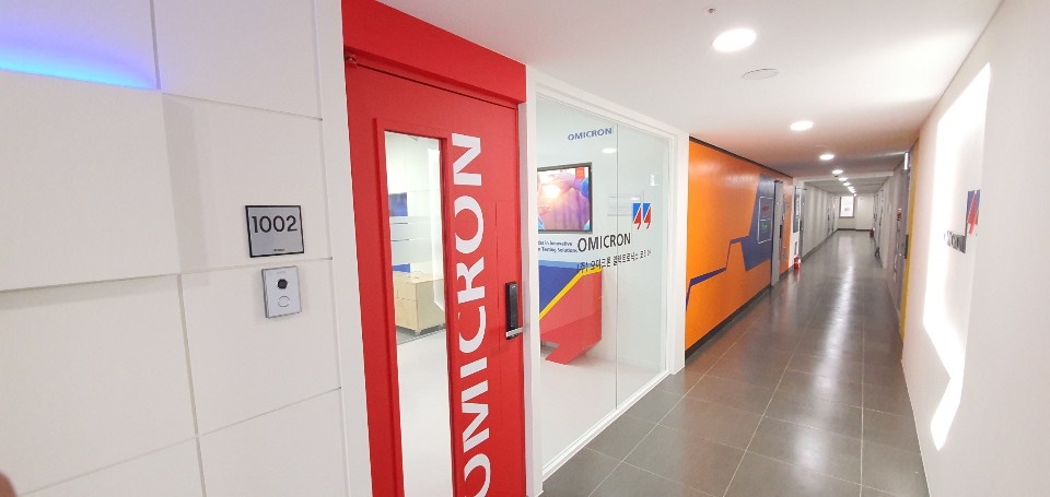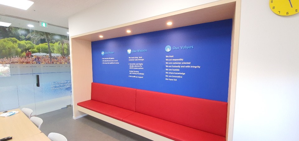 내부 역시 회사 로고와 컬러를 활용한 구조물을 설치해 임팩트를 줬고 전체적으로 유리를 가벽으로 설치해 개방성을 줬으며 밝은 조명을 설치해 화사하고 쾌적한 공간을 연출하면서 프로패셔널한 분위기를 만들고 있습니다.