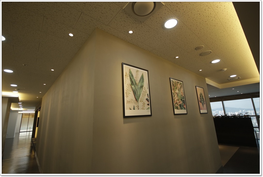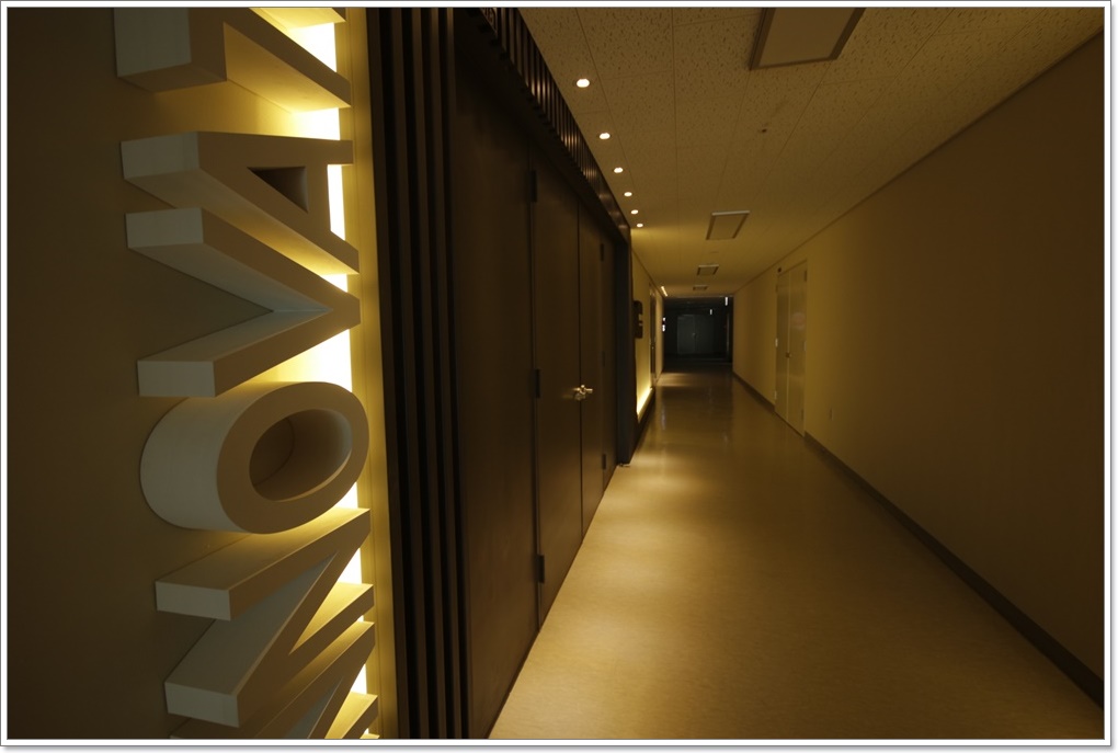 대회의실로 진입하는 복도는 그레이톤으로 차분하게 마감하고 액자를 걸어 포인트를 주었습니다. 복도와 회의실은 가볍고 경쾌한 느낌의 유리와 금속으로 가벽을 설치했는데요, 상하부는 투명 유리를 적용하고 중앙에는 아쿠아글래스를 적용해 개방감과 독립성을 동시에 부여했습니다. 회의실 내부는 심플하게 인테리어했고 대신 프로젝터, 스크린, 대형 조명을 시공해 사용성과 편의성을 높였습니다.