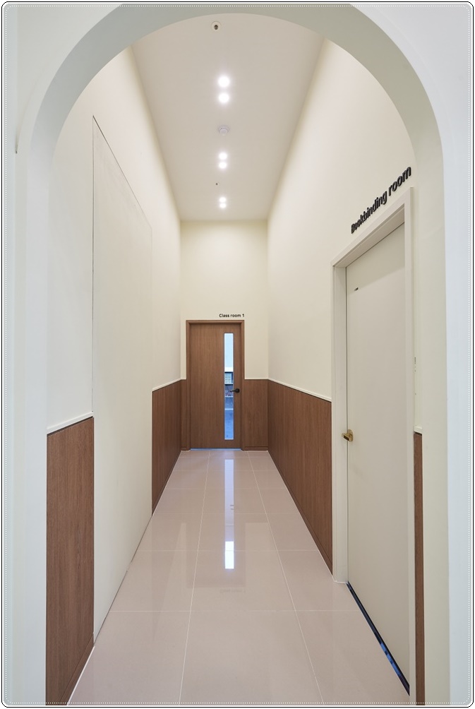 대신, 강의실은 집중력을 높일 수 있는 목공 가벽과 문을 적용해 학습능력을 높였습니다. 강의실 문은 부분적으로 타공해 유리를 적용함으로써 학생 케어를 할 수 있도록 했고 제본실은 목공문을 적용했습니다. 복도 벽면은 화이트를 적용하고 하단부엔 우드를 시공해 모던하고 세련된 느낌을 주었고 강의실 문과 제본실 문의 컬러를 달리해 가독성을 높였습니다. 부평 신도림 청라 예쁜학원인테리어로 분위기 UP!하고 싶으시다면 저희 916디자인에 문의해 주세요.