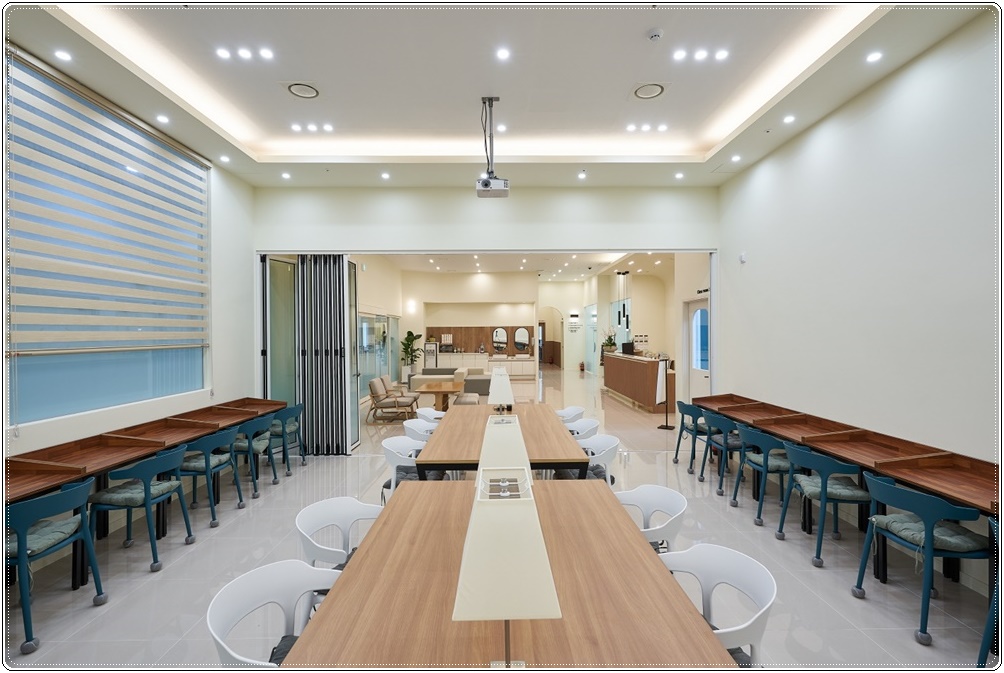 수업전과 후에 자율학습을 할 수 있는 공간을 원하셔서 강의실과 반대되면서 가장 안쪽의 외벽 공간으로 배치해 화이트와 우드를 적용한 인테리어를 진행해드렸습니다. 벽면, 천장, 바닥은 로비와 같은 컬러 및 마감재 등을 적용해 통일성을 이루면서 우드톤 테이블을 중앙과 벽쪽에 따라 배열해 스스로 학습할 수 있는 분위기로 조성했습니다.