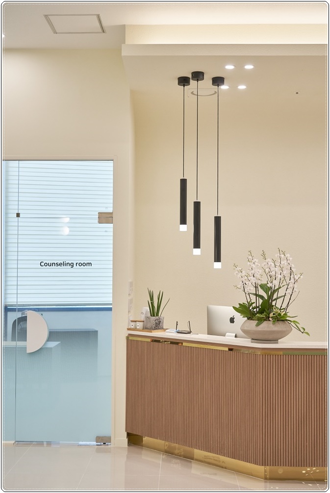 인포메이션 공간의 테이블 하단은 우드톤 템바보드를 적용해 클래식하면서 세련된 분위기의 인테리어와 어울리는데요, 여기에 골드 장식을 더하니 고급스러운 느낌까지 들었습니다. 학생들의 등록을 돕는 공간에는 감각적인 팬던트 조명을 시공해 멋스러운 공간이 되도록 했습니다. 천장과 모서리의 경계를 없앤 호라이즌 공법이 적용된 프론트월 덕분에 공간이 더욱 높고 넓어 보여 답답한 느낌이 없네요.