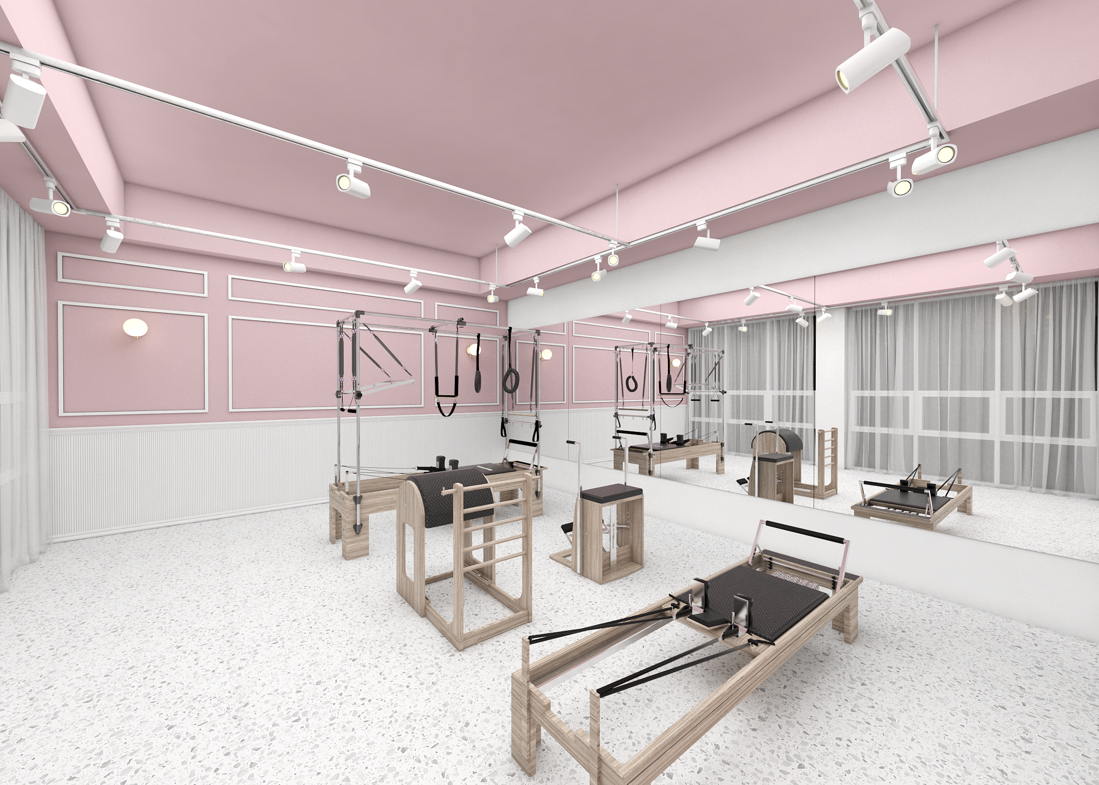또한 개인 프라이빗룸에서 진행되는 필라테스의 경우 화사한 것이 답답함을 줄일 수 있어 핑크로 연출하였는데요. 대비되는 색상이 더욱 잘 어울리고 의외의 조합이 밸런스를 맞출 수 있지 않을까하여 클라이언트 분과 이야기를 나눈 방향성이었습니다. 그렇다면 과연 사전의 3D 이미지와 현재의 모습은 어떤 부분이 다르고 같은지 보러 가실까요?